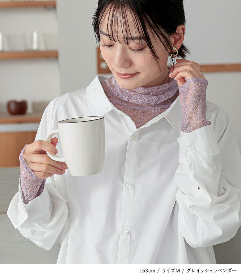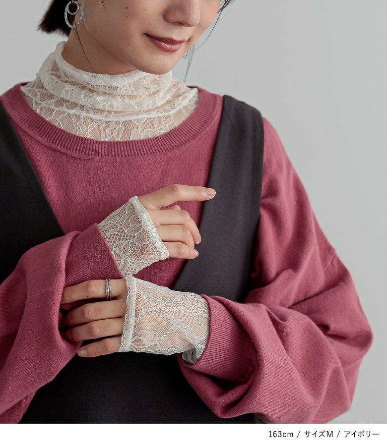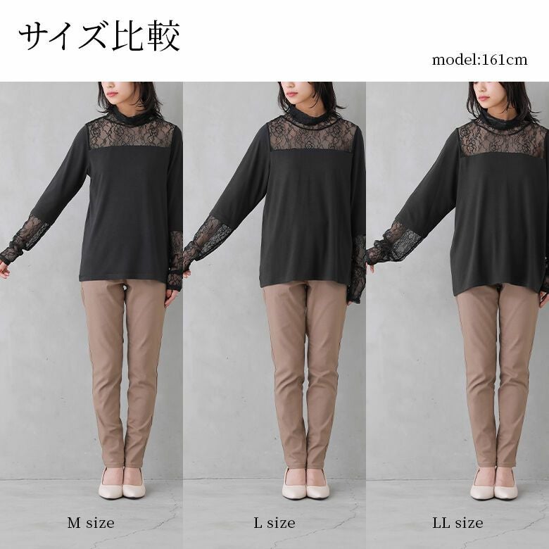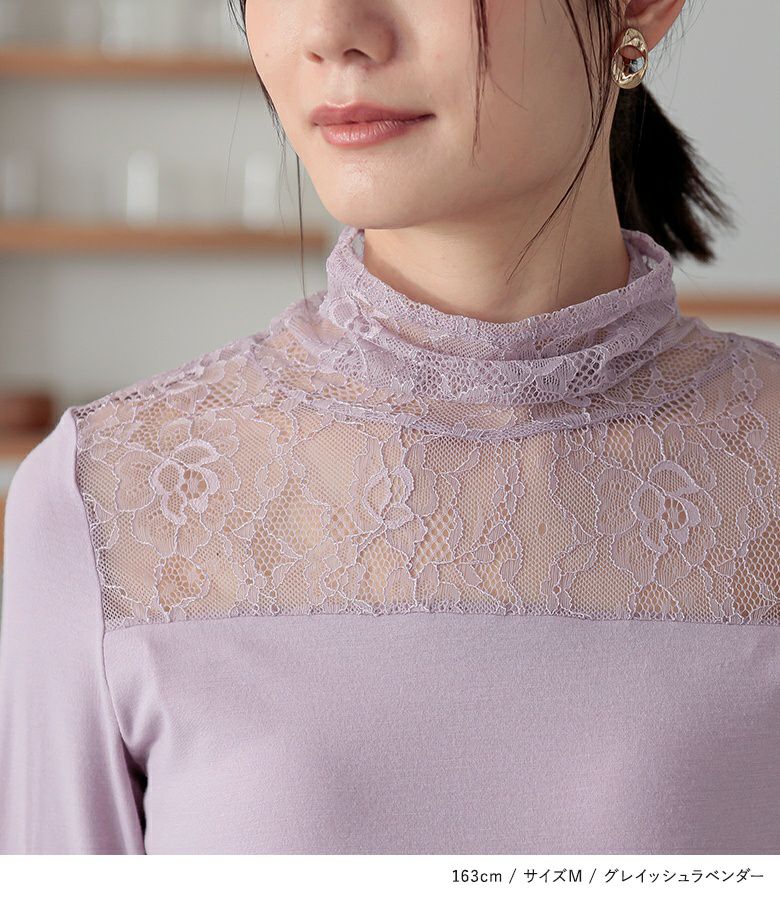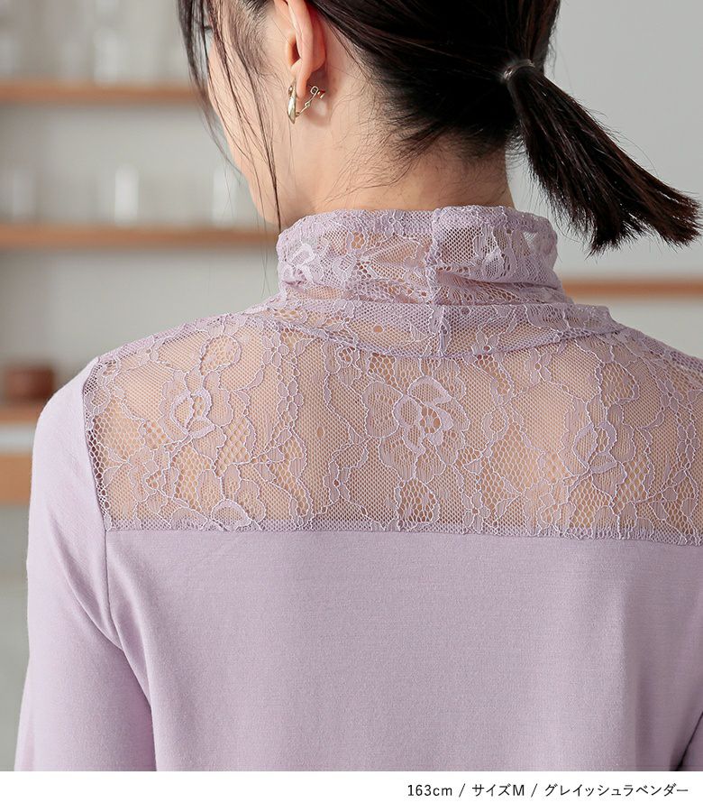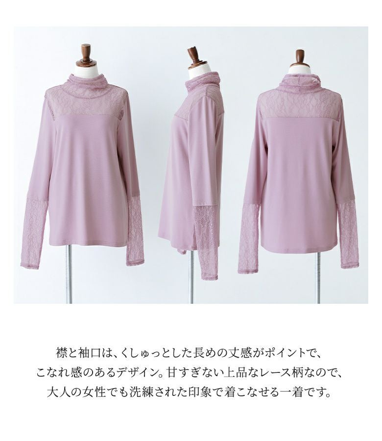 長めに切り替えた襟と袖のクシュっと感と、繊細で可愛すぎないレース柄が上品に大人カジュアルを演出します。M、L、LLの3サイズ展開からお好みのシルエットをお選びください。