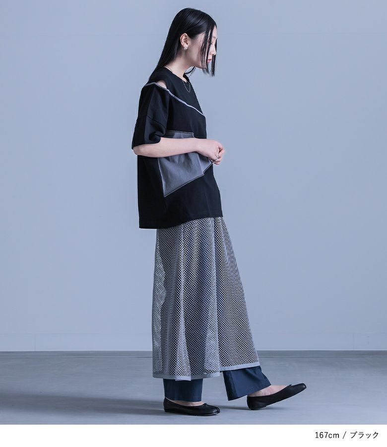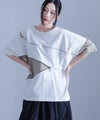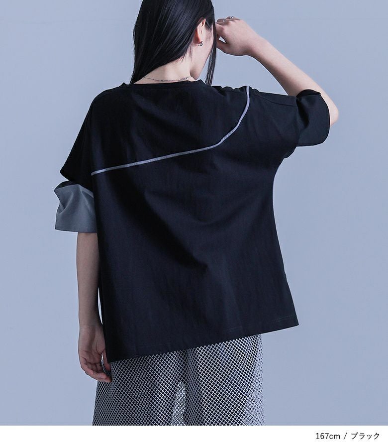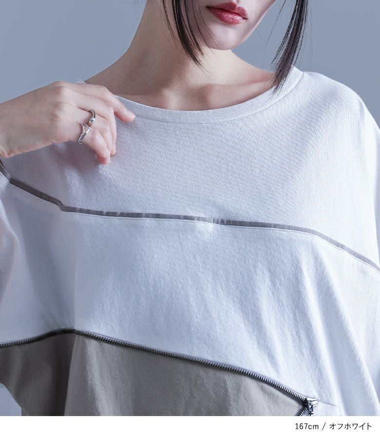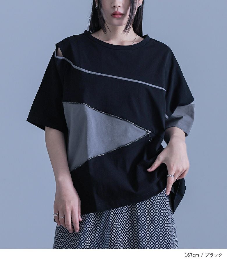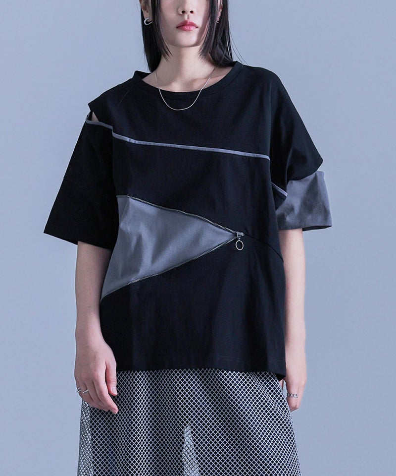 前身頃のファスナーデザインとカーブライン、左右で異なるアシンメトリーな袖が印象的な配色デザインTシャツ。袖部分にはカッティングデザインを施し、さり気ない肌見せがアクセントに。後ろにもカーブラインをあしらい、前後どちらから見てもデザイン性のある一枚です。ファスナーのカラーにはモードな雰囲気のアンティークシルバーを使用し、細部にまでこだわりました。