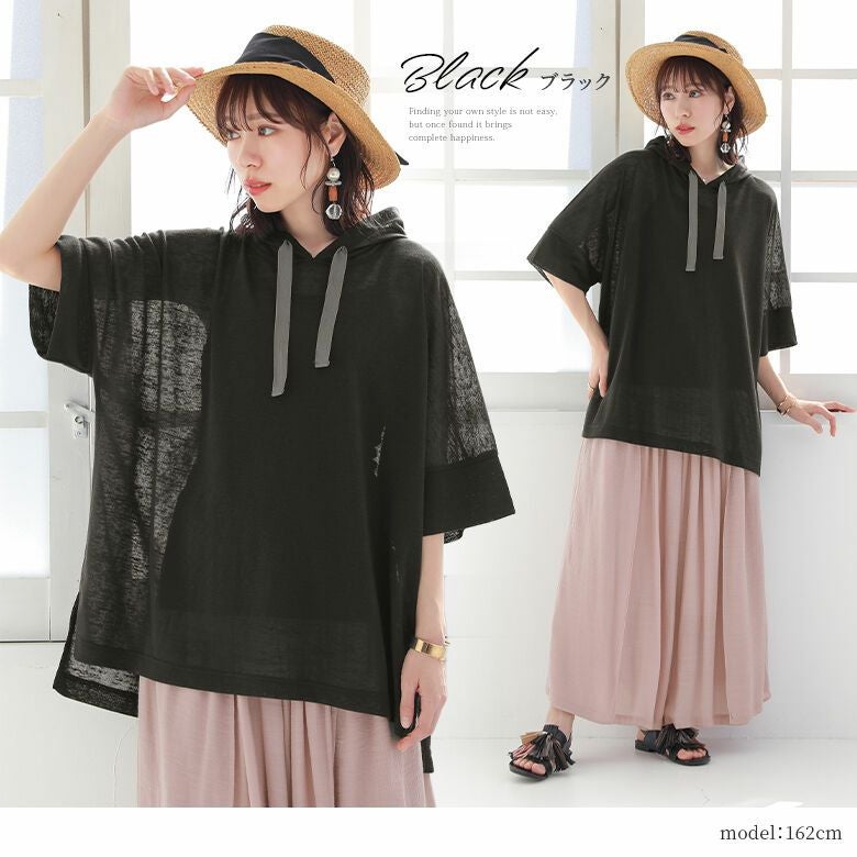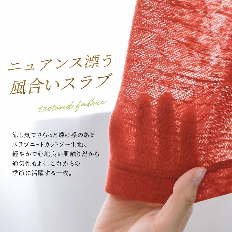 涼し気でさらっと透け感のあるスラブニットカットソー生地は、軽やかで心地良い肌触り。通気性も良く、暑い季節にも活躍します。