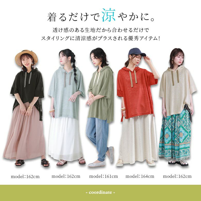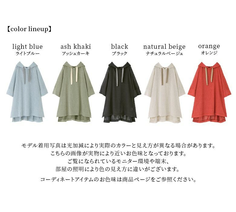 カジュアルが好みですがフードがあると重くなるのがネックでした。こちらは生地が軽いので問題なく涼しく可愛いし色違いでも購入したいです。