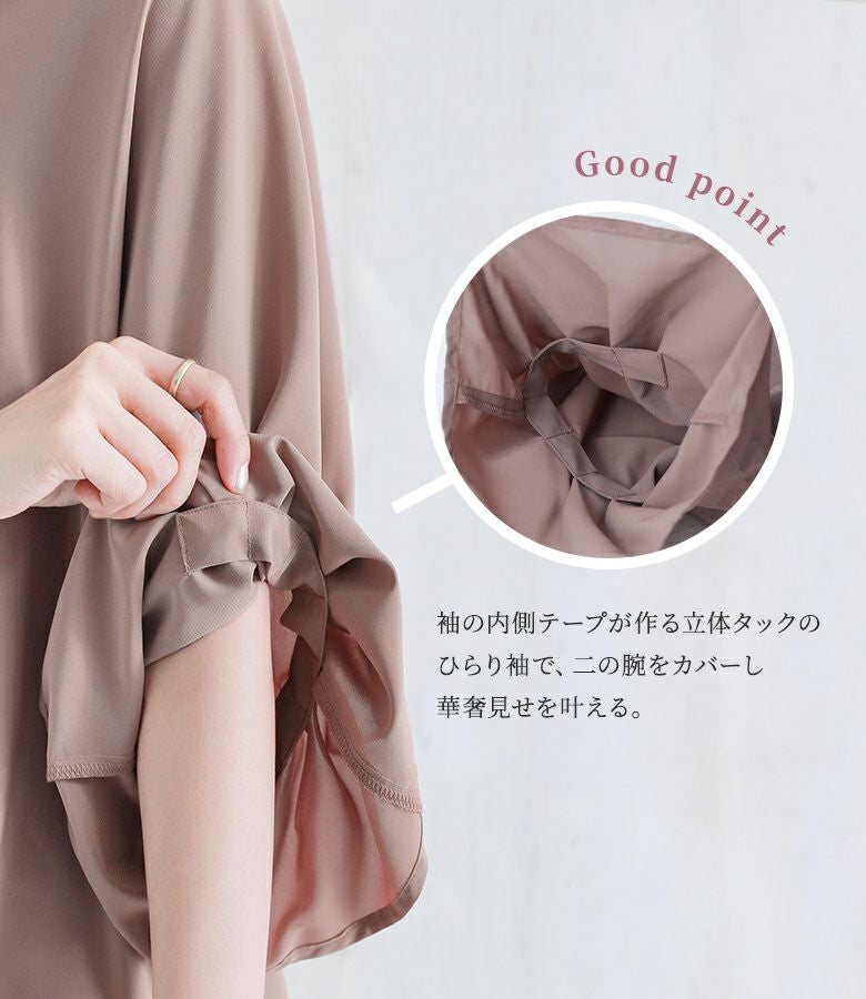 袖の内側テープが作る立体タックのひらり袖が、二の腕をカバーし華奢見せを叶える。