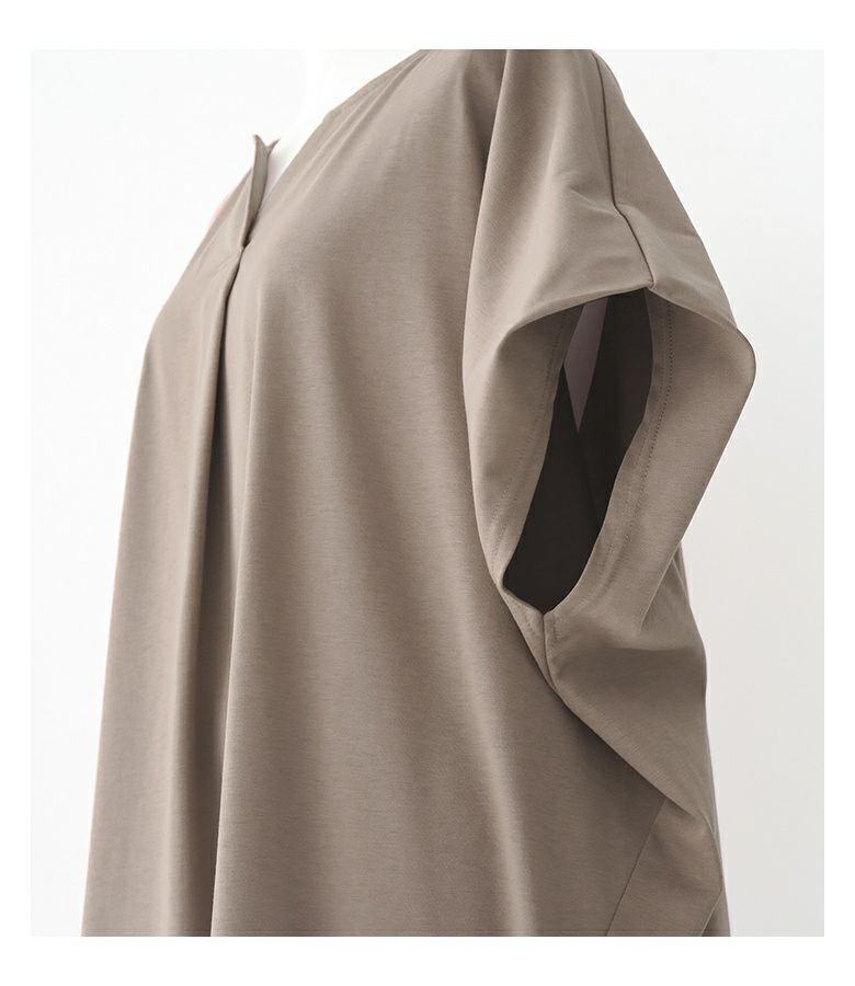 デコルテをスッキリ見せるキーネックと、前後差&スリット入りの裾で抜け感をプラス!前中心にタックが入った立体的なデザインで体形カバーも実現。