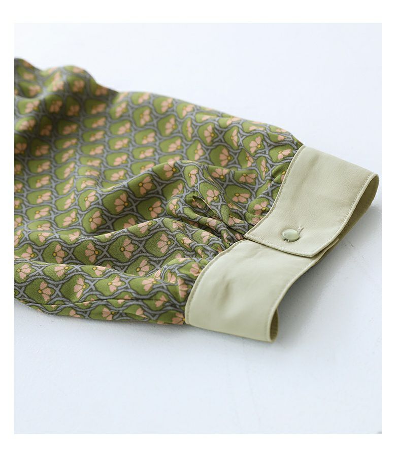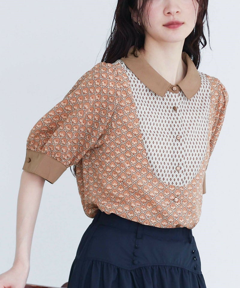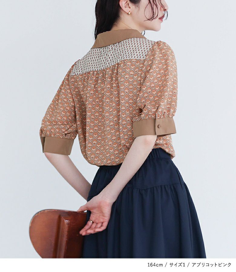 2種類のレトロ柄×無地のデザインが視線を奪う、個性派ブラウス。ぽわん袖が女性らしさをプラスし、同系色でまとめたニュアンスカラーが落ち着いた雰囲気に仕上げてくれる。