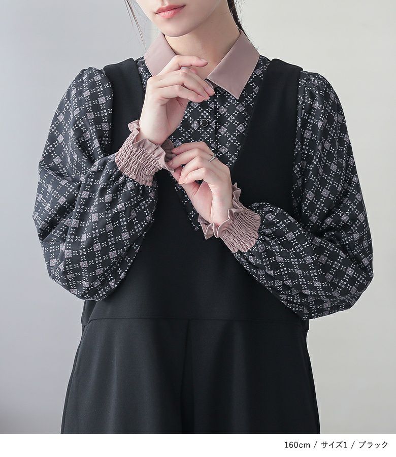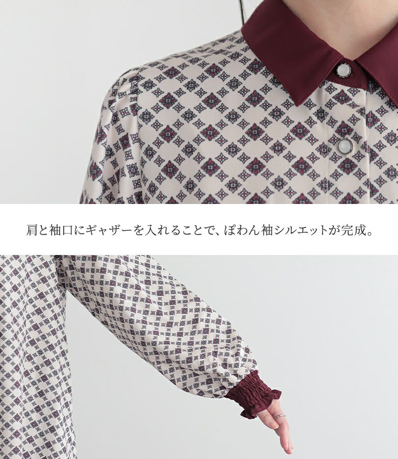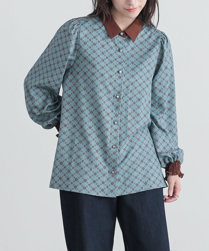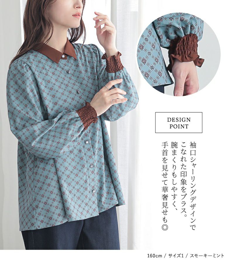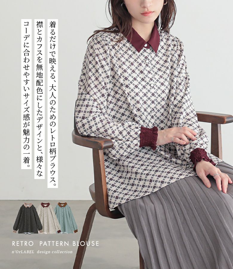 着るだけで映える、大人のためのレトロ柄ブラウス。襟とカフスを無地配色にしたデザインと、様々なコーデに合わせやすいサイズ感が魅力の一着。