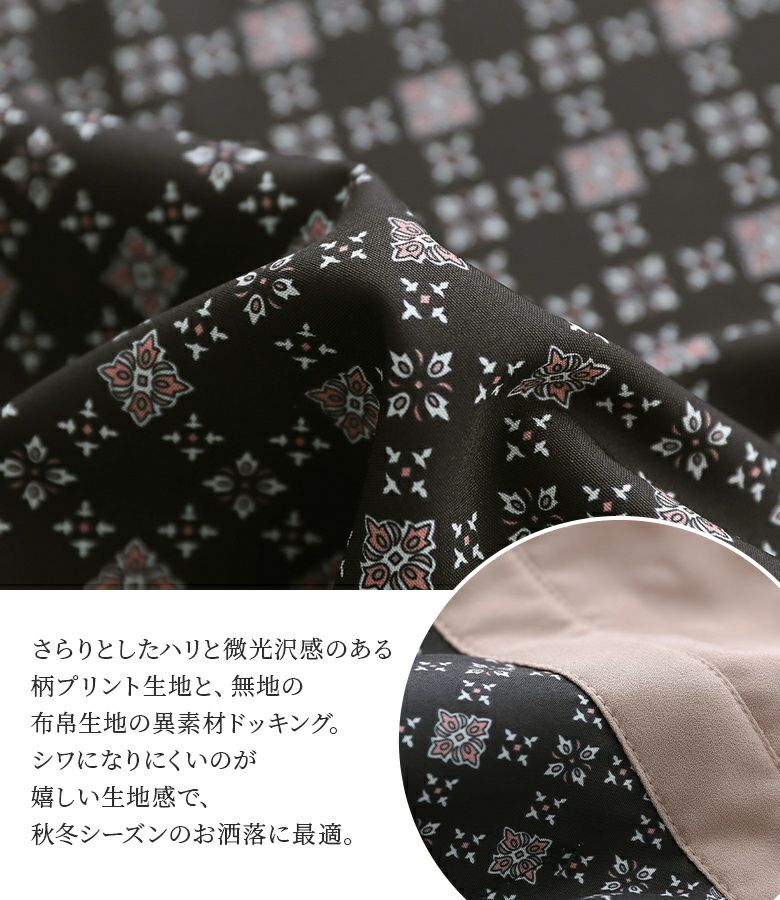 さらりとしたハリと微光沢感のある柄プリント生地と、無地の布帛生地の異素材ドッキング。シワになりにくいのが嬉しい生地感です。