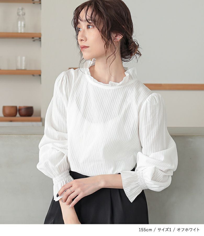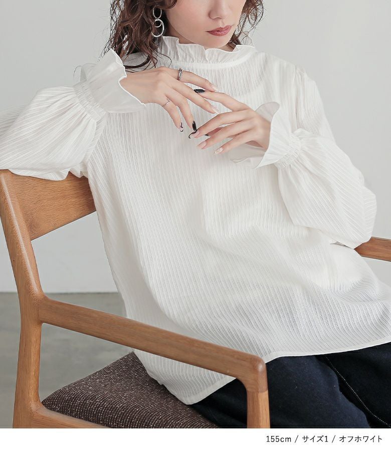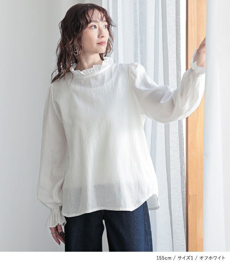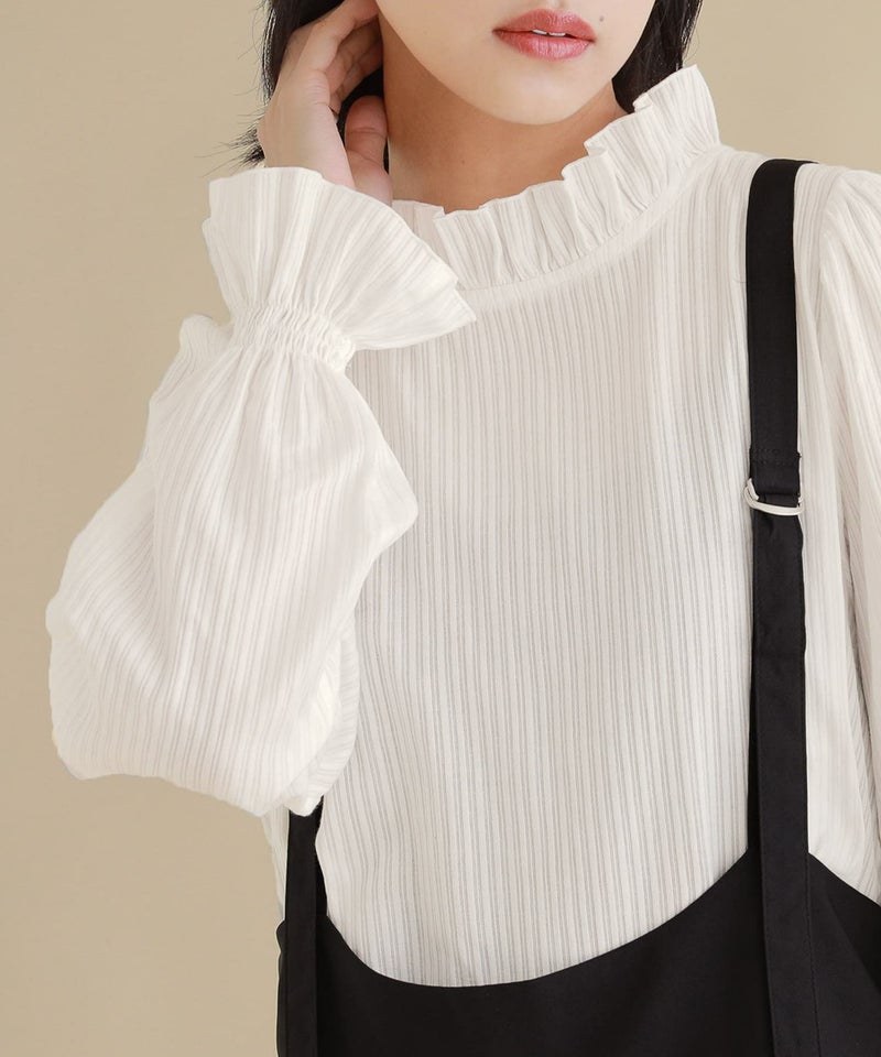 軽やかに仕立てた襟と袖口のフリルデザインと、細めのドビーストライプの織り柄が、風合いを放つブラウス。