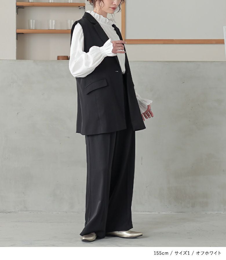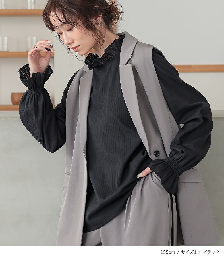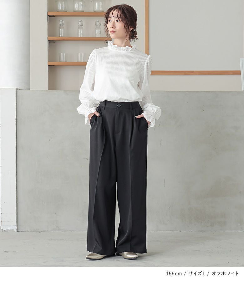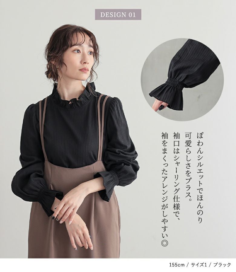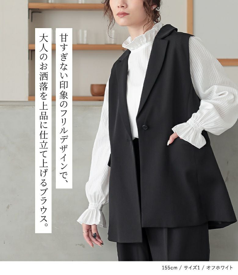 軽やかに仕立てた襟と袖口のフリルデザインと、細めのドビーストライプの織り柄が、風合いを放つブラウス。