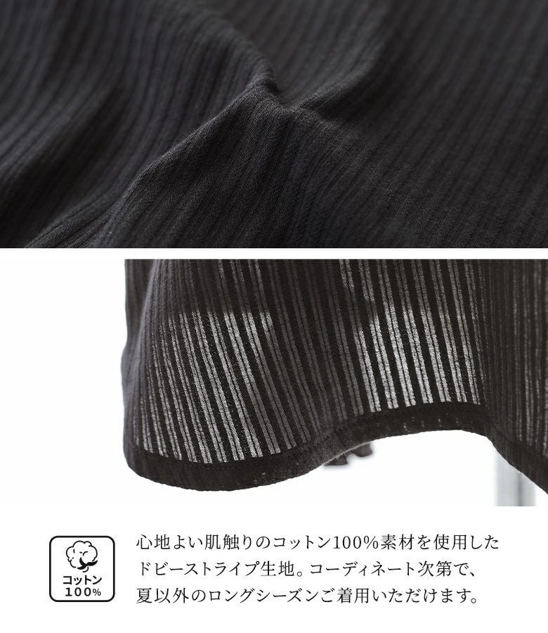 心地良い肌触りで、軽くて柔らかいコットン100%のドビーストライプ生地は、程よい透け感とナチュラルな風合いでロングシーズン活躍します。