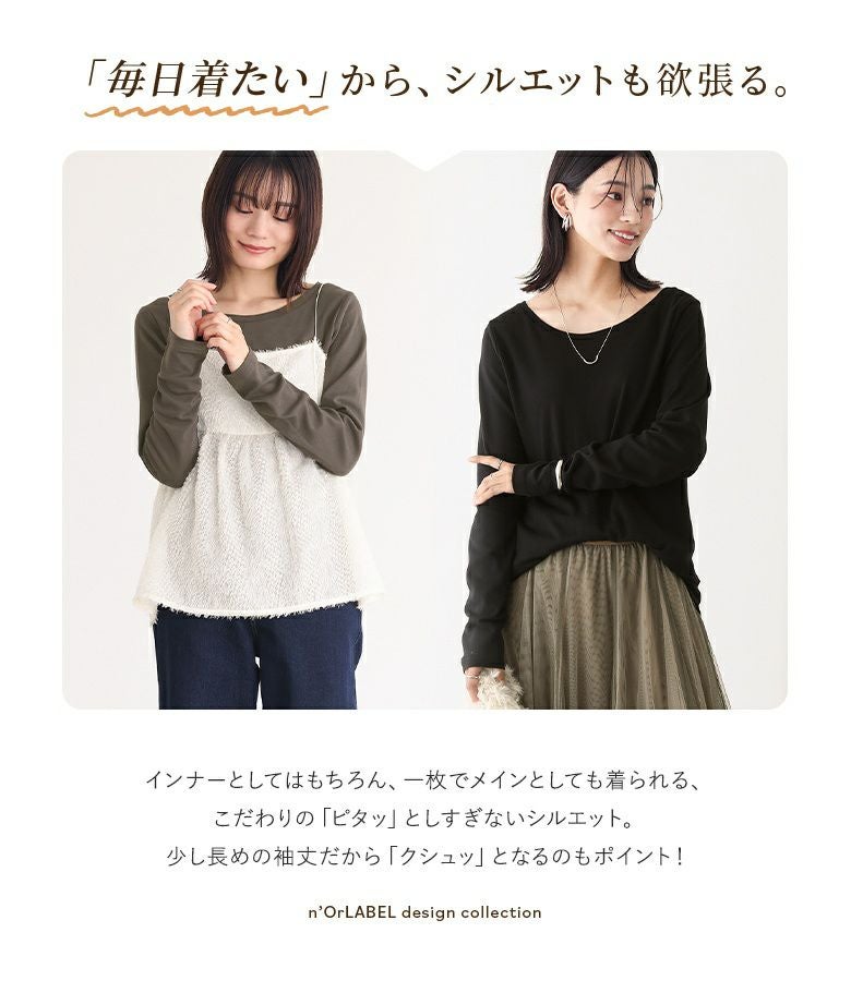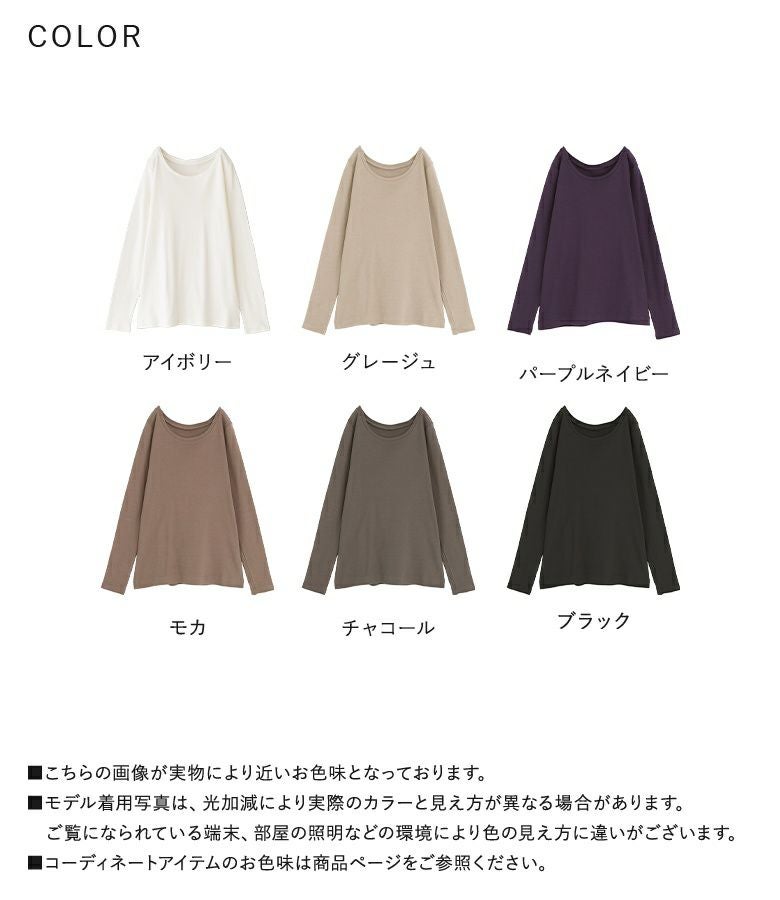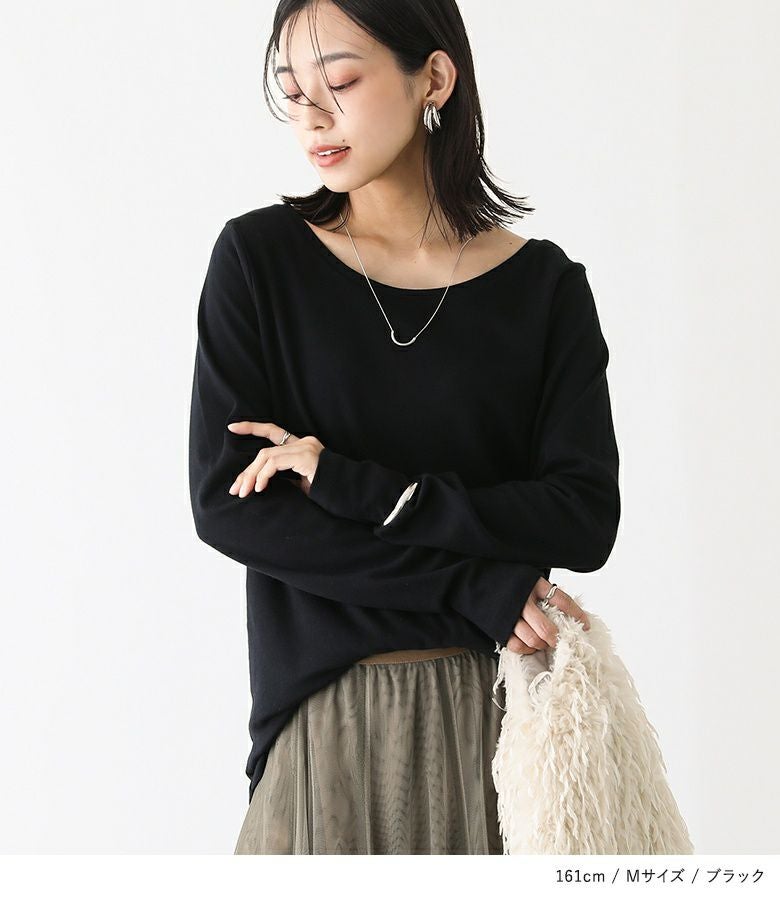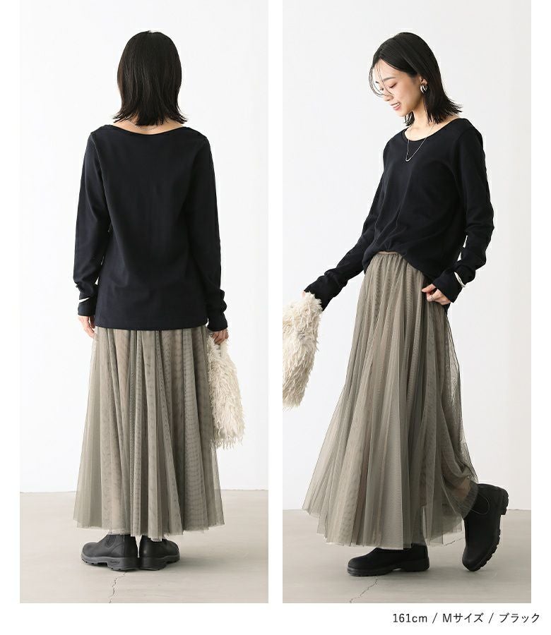 襟ぐりが広いのでニットの重ね着をしても見えにくい。