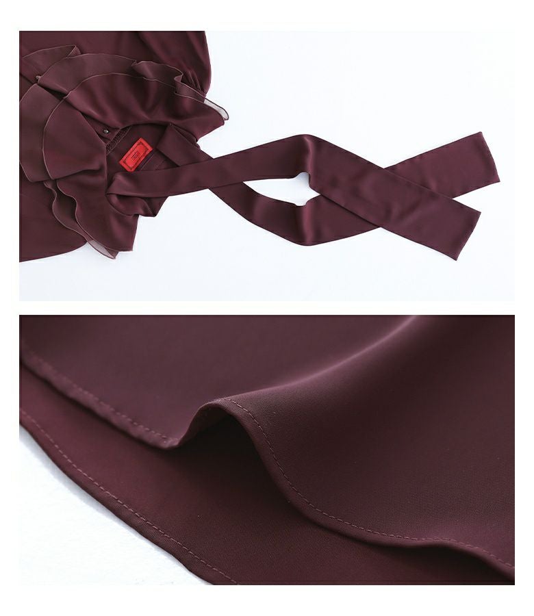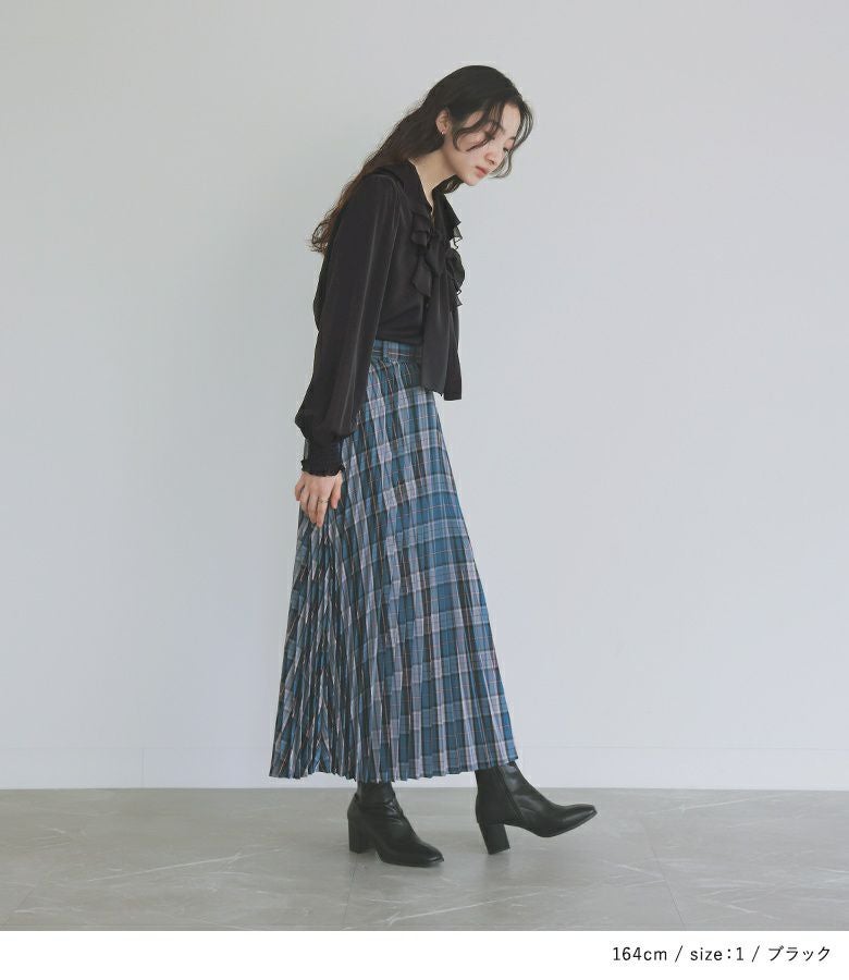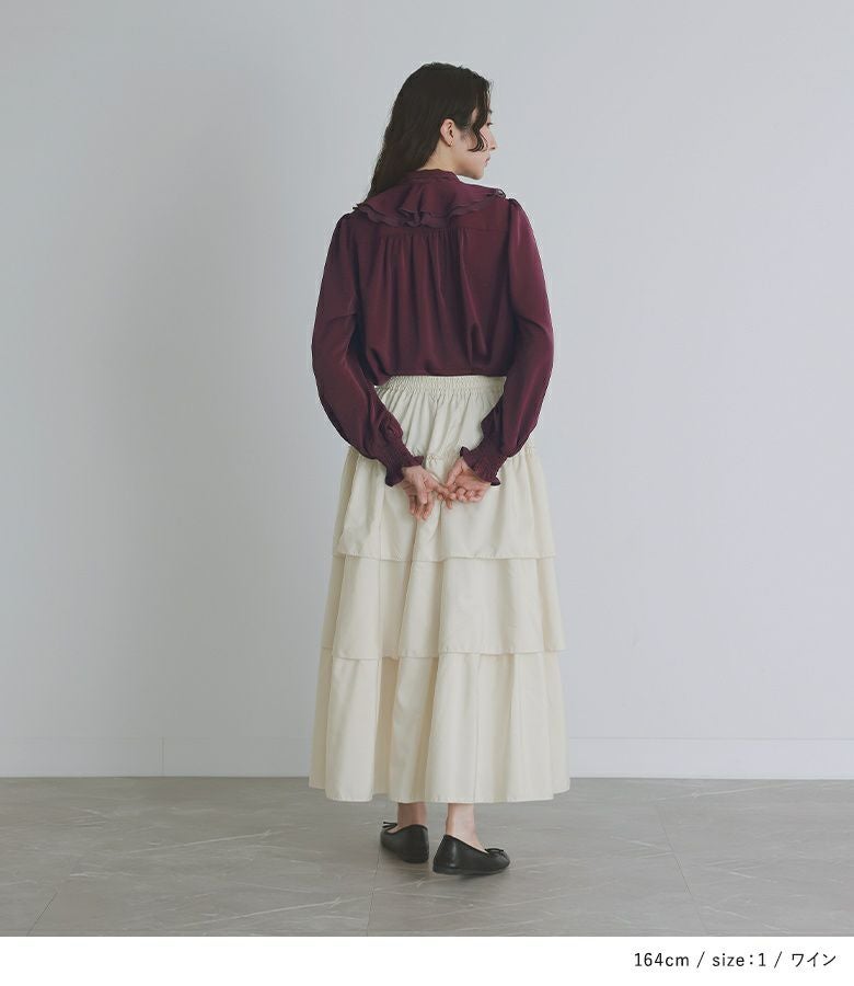 とろんとした落ち感とほんのり光沢感のある柔らかな綺麗め生地を使用。下側のラッフルフリルには透け感のあるシフォン生地をドッキングした、贅沢な異素材使いで、ロングシーズンに最適。