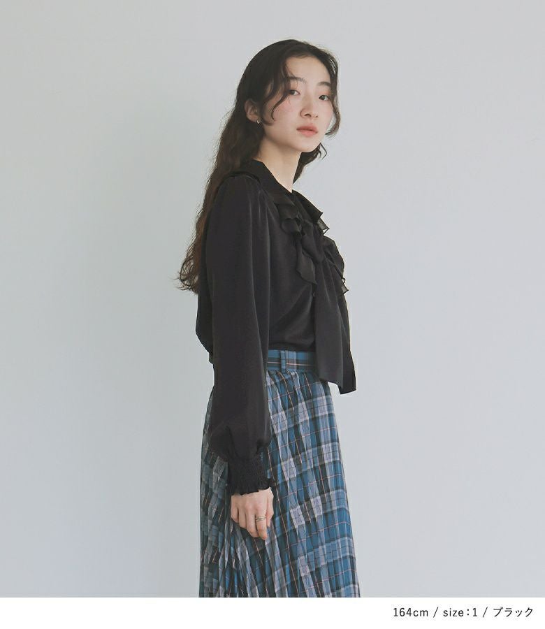 とろんとした落ち感とほんのり光沢感のある柔らかな生地を使用。襟元のラッフルフリル下部分には透け感のあるシフォン生地を使用し、さり気ない異素材使いが上品な一枚です。