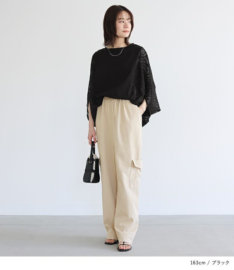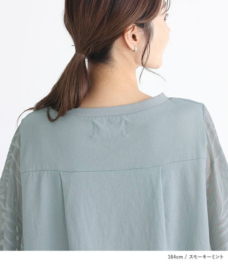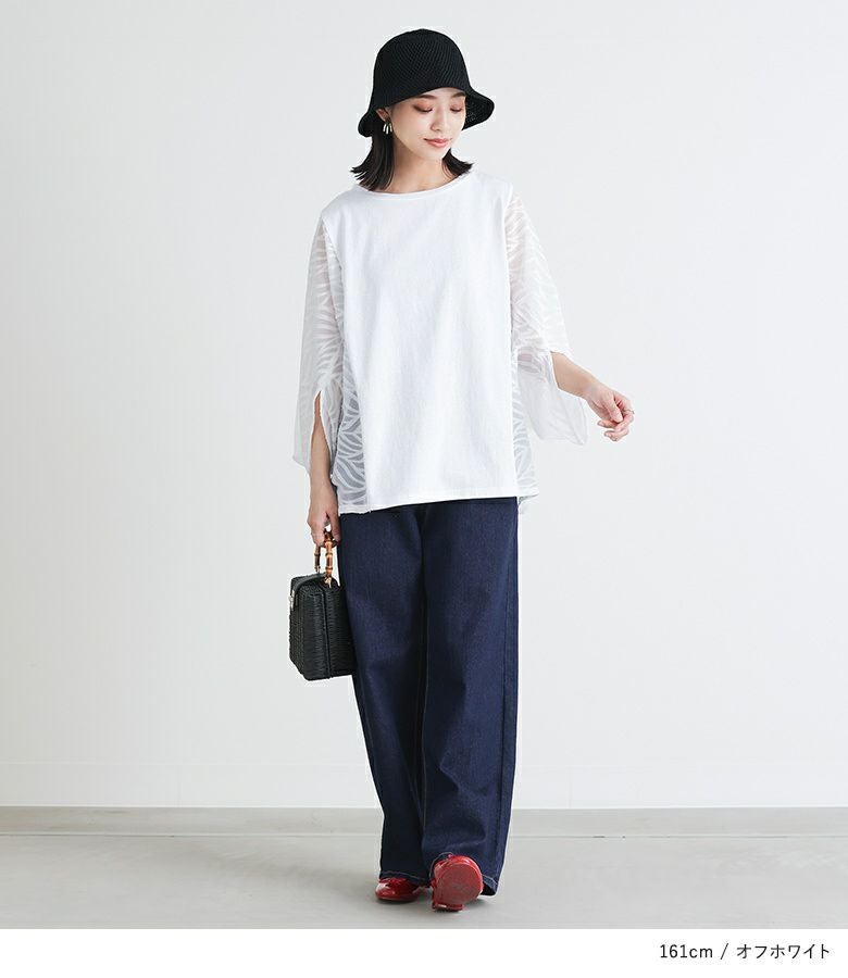 身頃はコットン100%のカットソー生地で、さらりと心地良い肌触り。切り替え部分はポリエステルのカットジャカードで、ほんのり透け感があり軽やかな素材感です。
