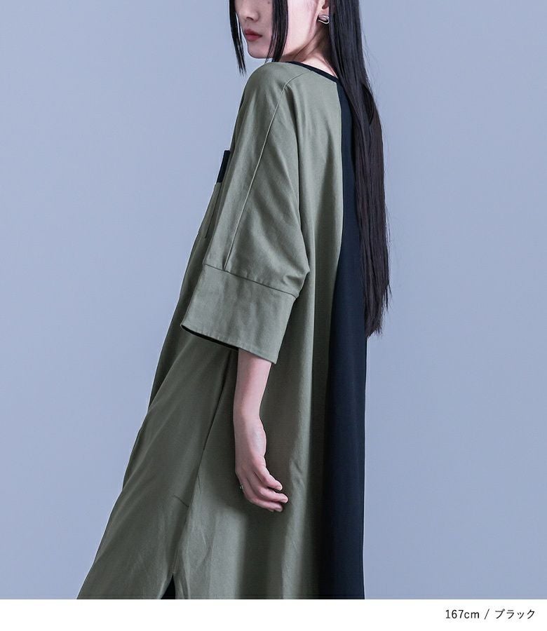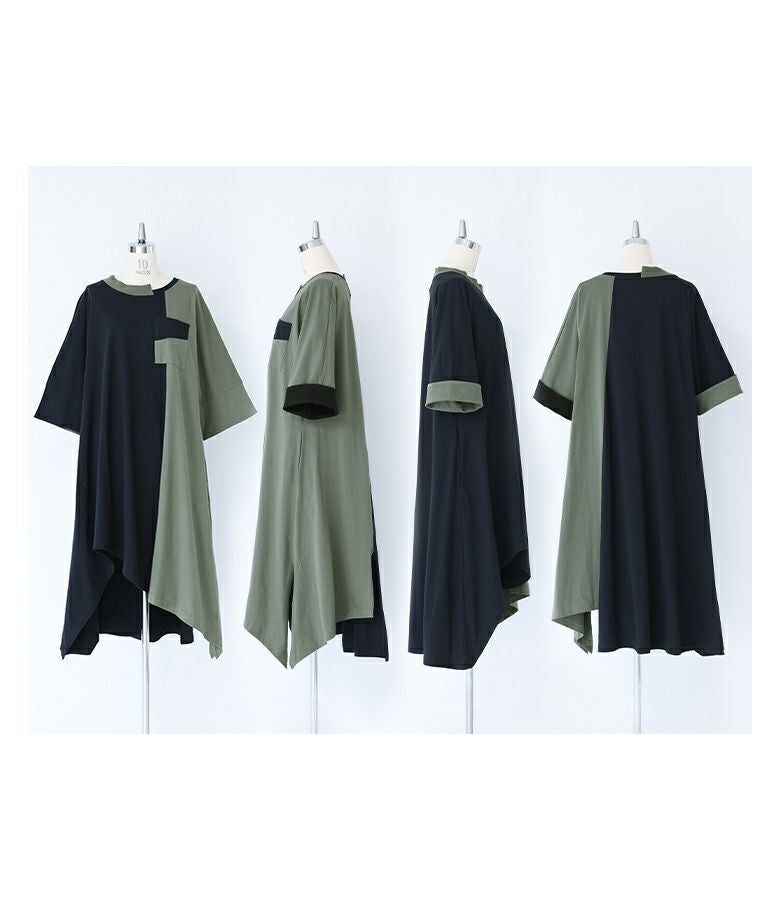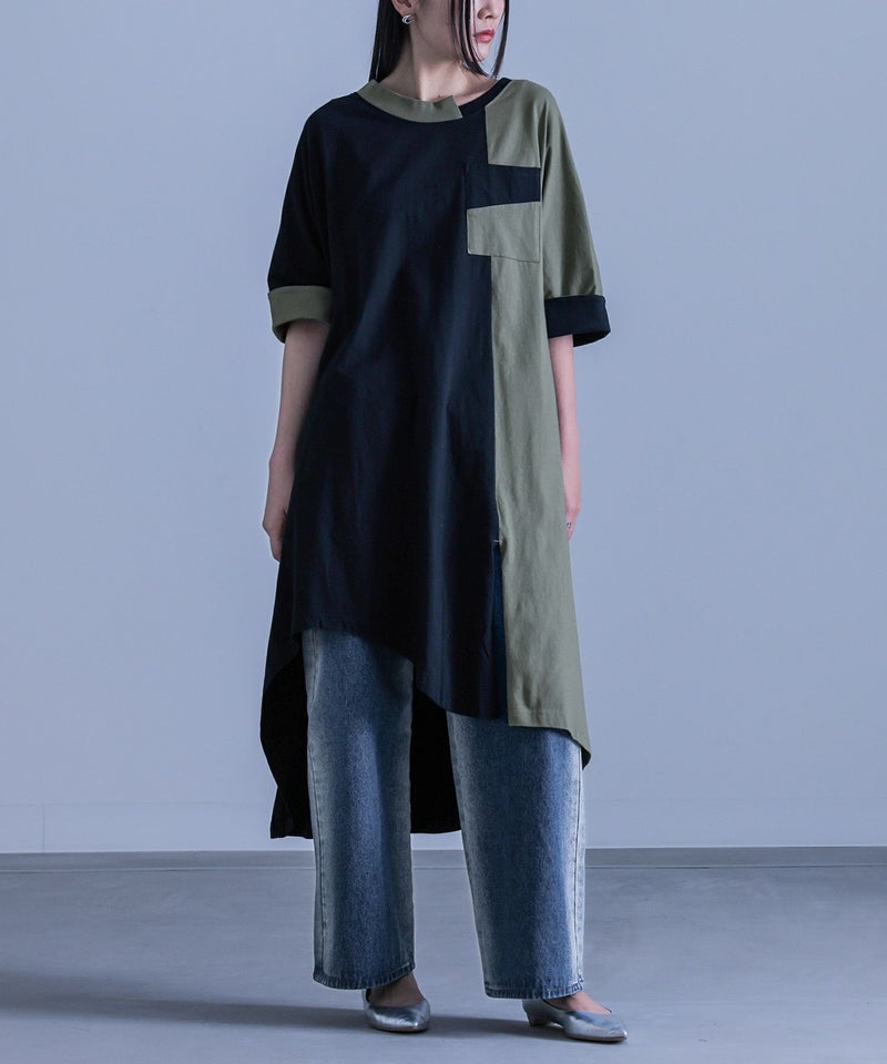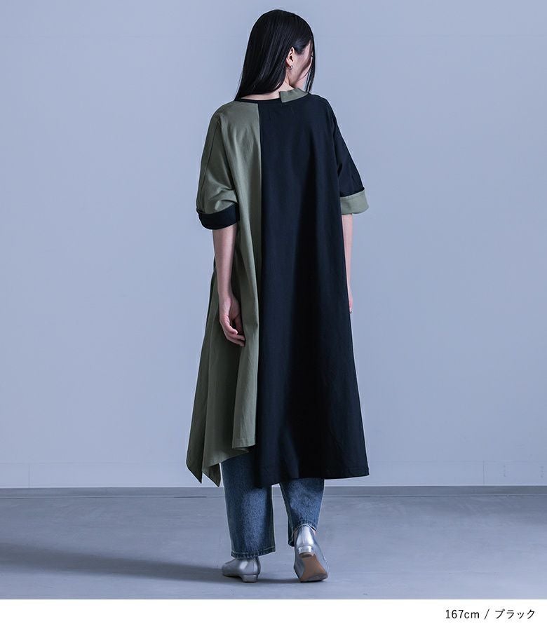 大胆な切り替えと配色デザインが目を惹くワンピース。裾・襟ぐりのアシンメトリーなデザインが個性的でモードな雰囲気の一枚です。袖口は裏地を配色にしており、そのままでも一回折り返しても着用できる、アレンジが楽しめる仕様です。
