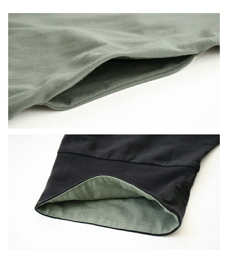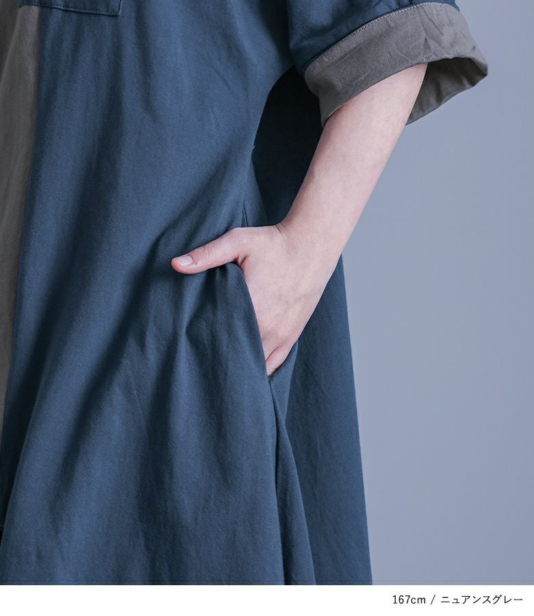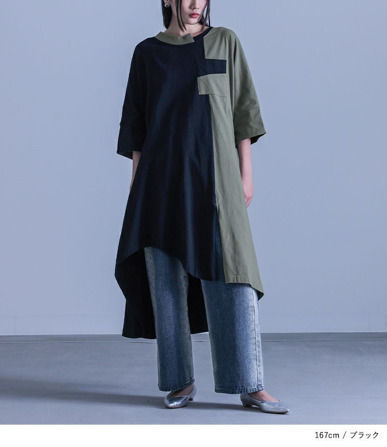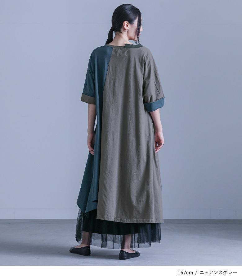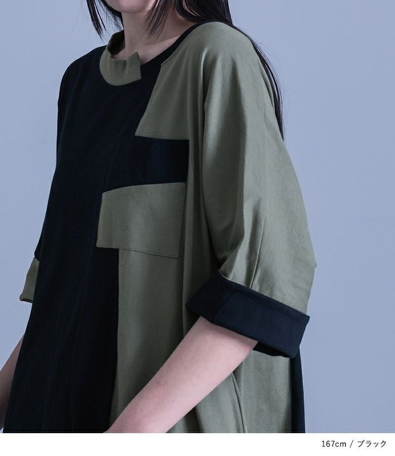 大胆な切り替えと配色デザインが目を惹くワンピース。裾・襟ぐりのアシンメトリーなデザインが個性的でモードな雰囲気の一枚です。袖口は裏地を配色にしており、そのままでも一回折り返しても着用できる、アレンジが楽しめる仕様です。