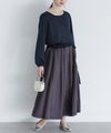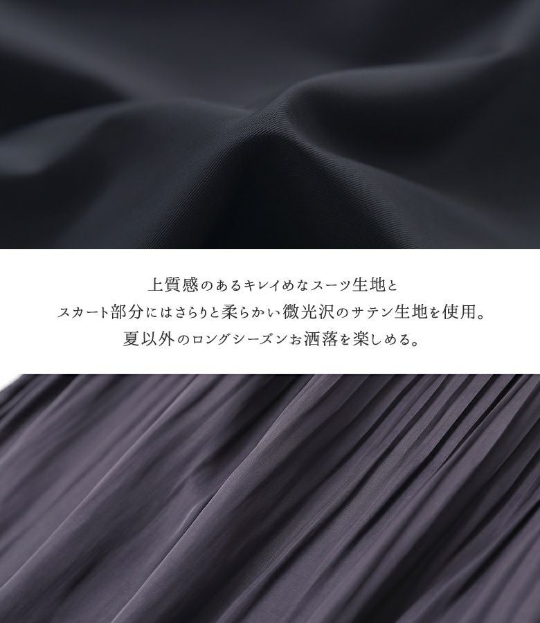 上質感のあるスーツ生地に、さらりと柔らかい微光沢のサテン生地を使用したプリーツをドッキング。同素材のジャケットを合わせれば、フォーマルもカジュアルな装いにも活躍するセットアップが完成♪さらに、選べるM~3Lサイズ展開が嬉しいポイントです。