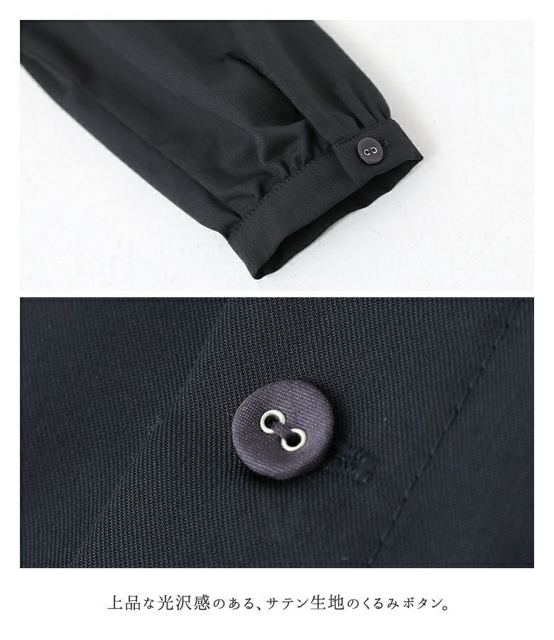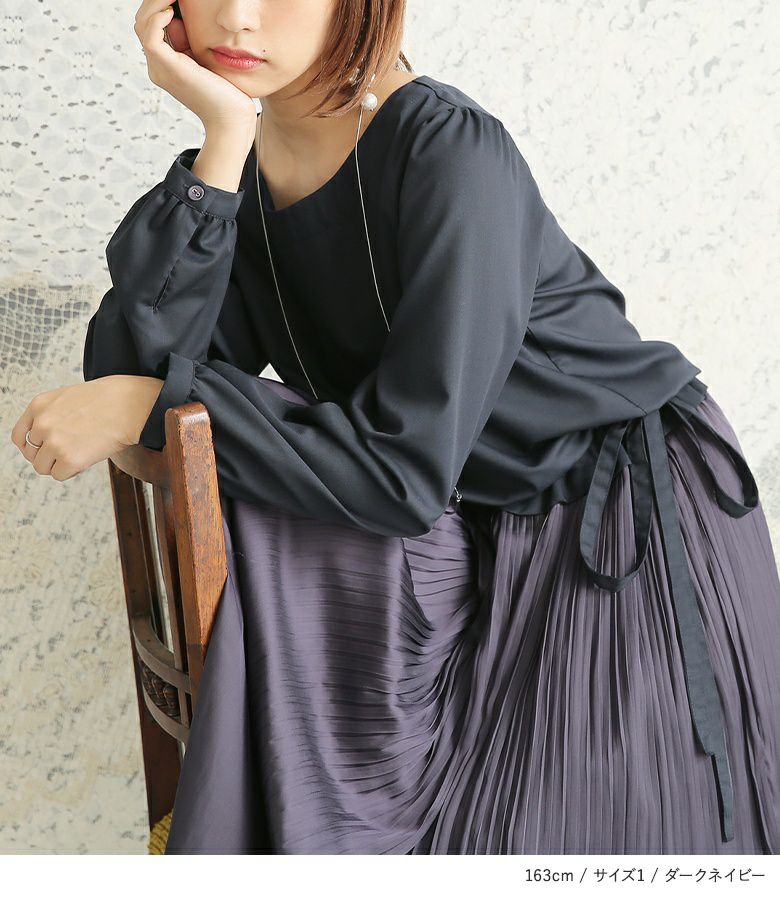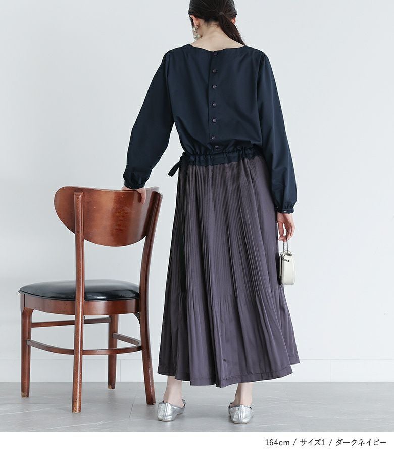 裾に向かって広がるランダム消しプリーツで上品なお洒落印象を醸し出す。後ろ姿までお洒落なバックボタンデザインだから、差のつくお洒落を叶えてくれる。ウエストリボンでブラウジングして印象チェンジも簡単です。