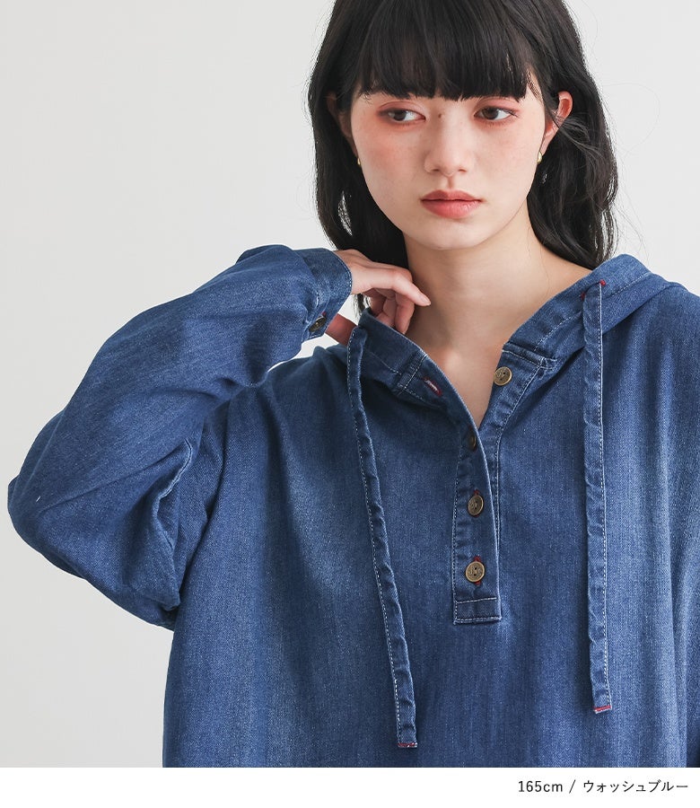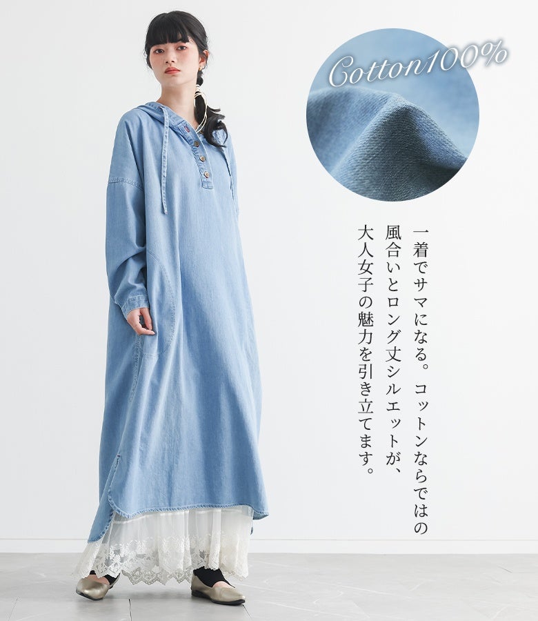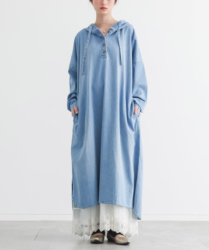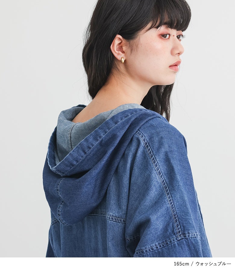 抜け感を発揮するフード付きデニムワンピース♪