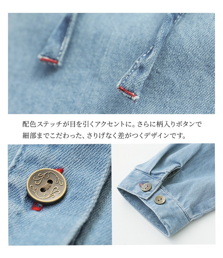 赤色のステッチや柄入りのボタンなど、細部の装飾にもこだわりが光るitemです。
