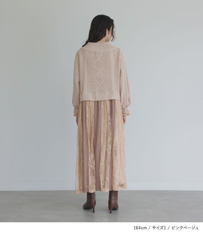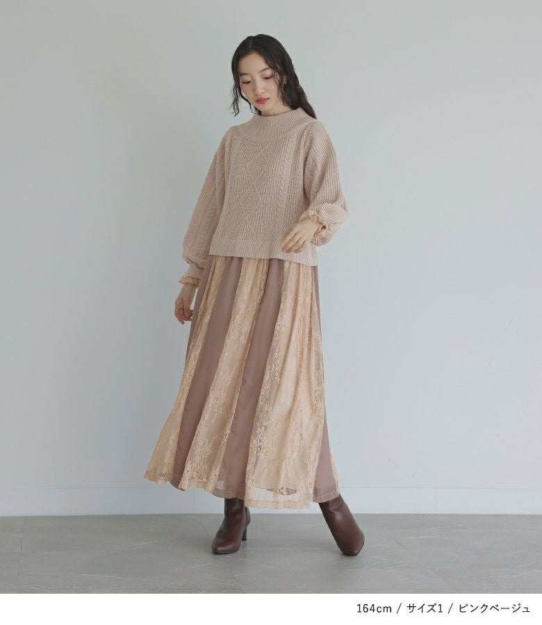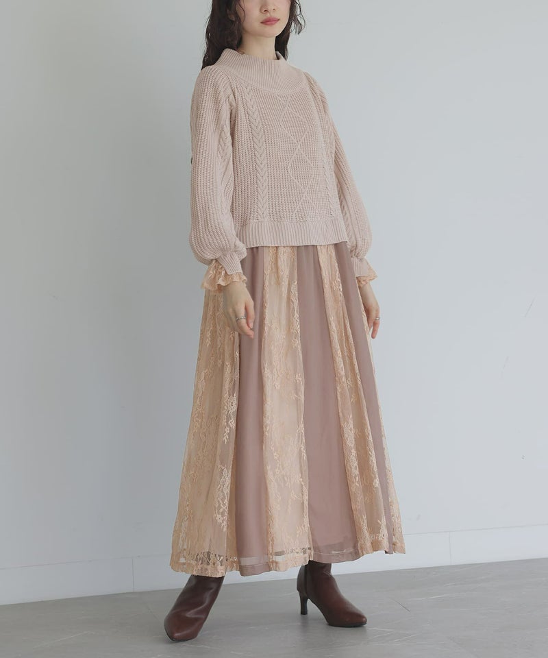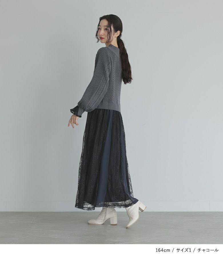 トップス部分は柄にこだわったしっかりとした厚みのケーブルニット。スカート部分はシアー感のある繊細なレースとシフォン生地を切り替えた、落ち感がキレイなデザインです。