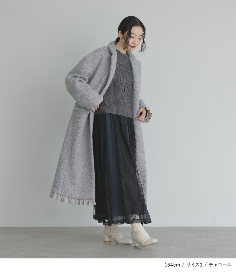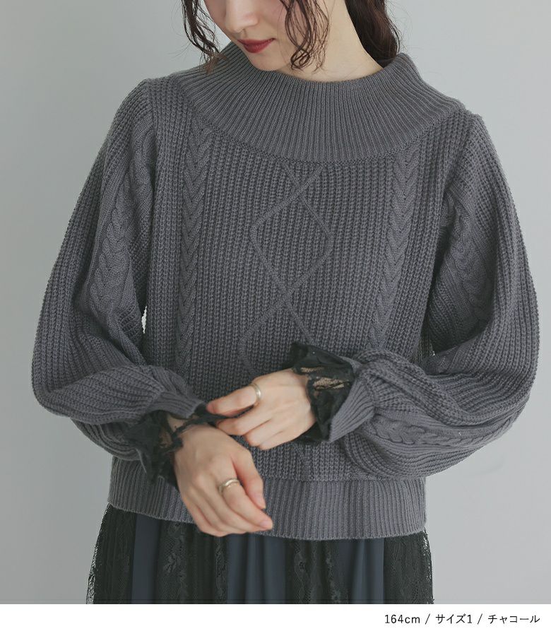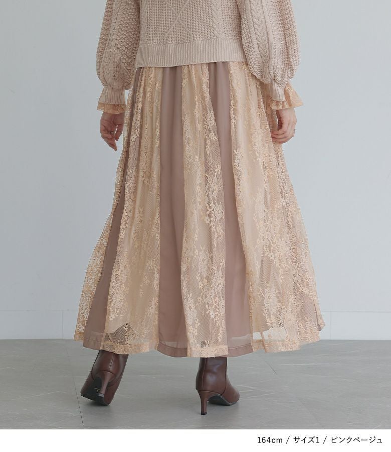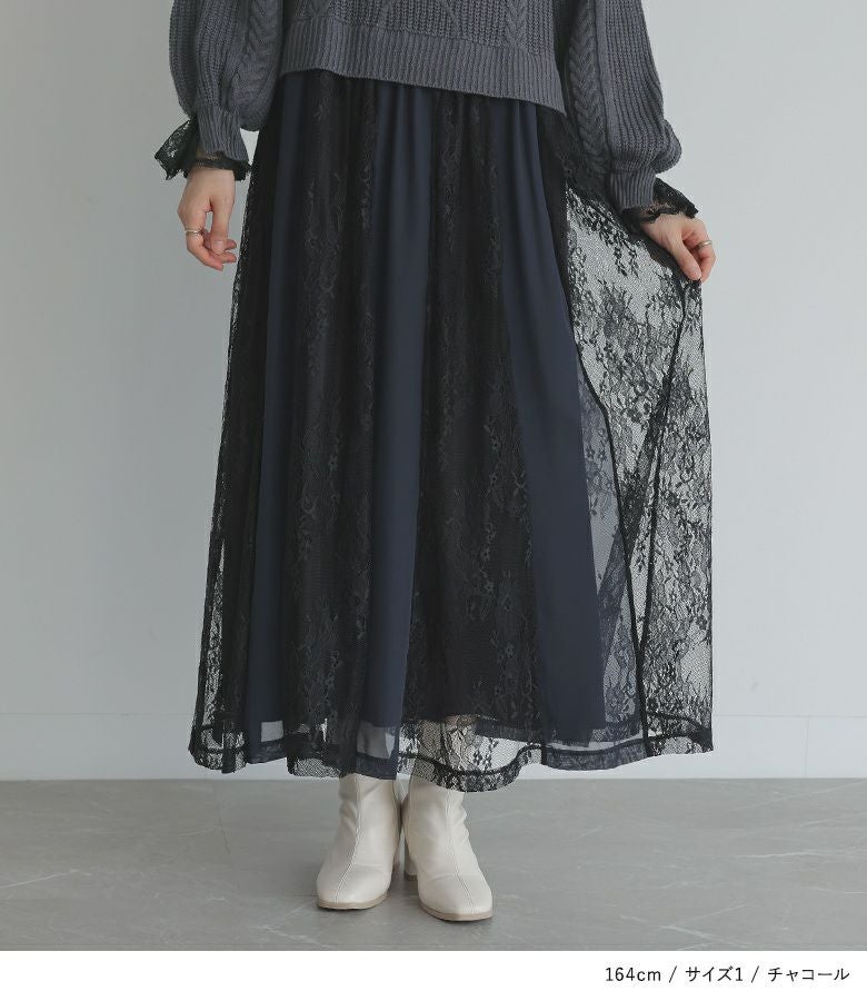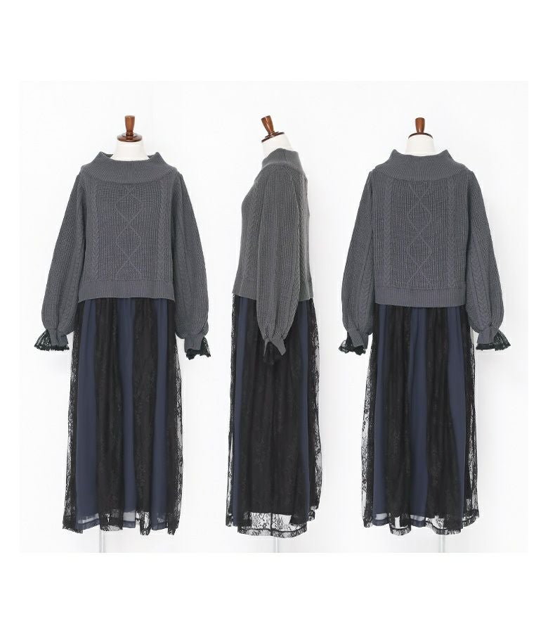 トップス部分は柄にこだわったしっかりとした厚みのケーブルニット。スカート部分はシアー感のある繊細なレースとシフォン生地を切り替えた、落ち感がキレイなデザインです。