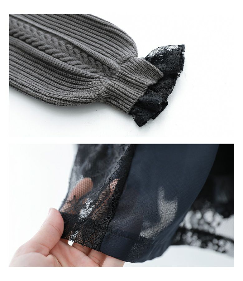素材本体ニット:アクリル100% 別布レース:ナイロン100% 別布シフォン:ポリエステル100% 裏地:ポリエステル100%