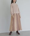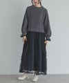 ニットトップスにスカートをドッキングした異素材デザインのワンピース。落ち着いた微配色が上品な印象のアイテムです。女性らしいぽわん袖は袖口からレースを覗かせてデザイン性をプラス。スタンドカラーで程良く抜け感のある一枚です。