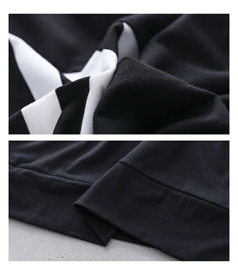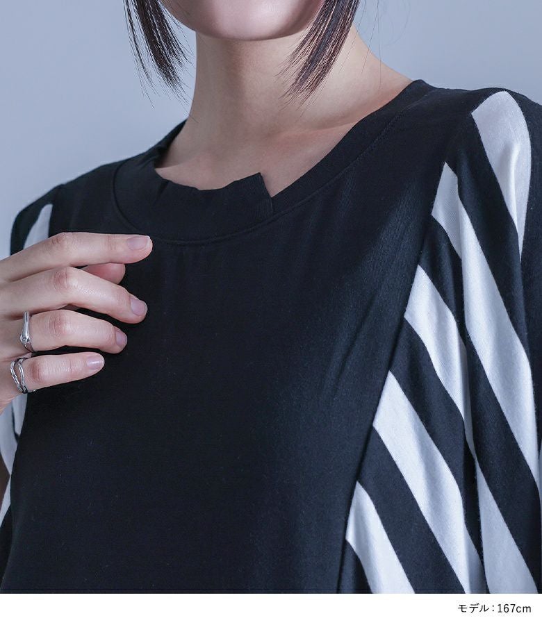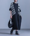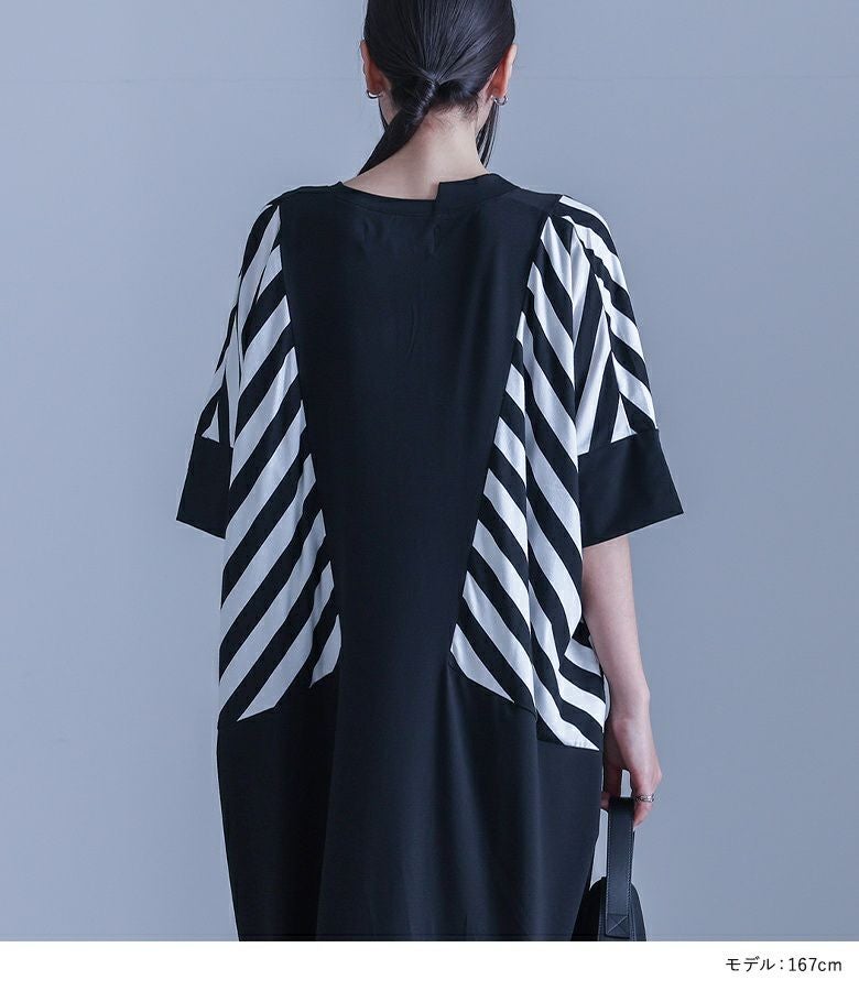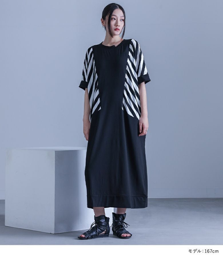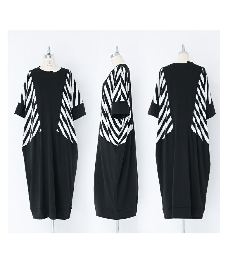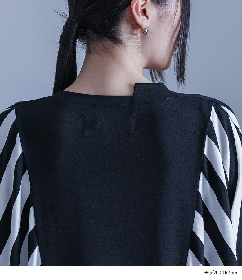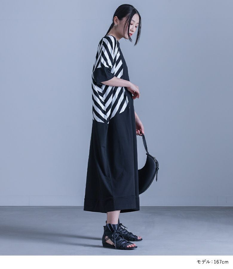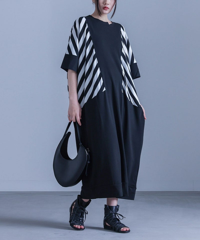 大胆にあしらったボーダー柄が目を惹く、モードな雰囲気のコクーンシルエットワンピース。襟元のアシンメトリーデザインがさり気ない個性をプラスします。ドルマンスリーブ&コクーンシルエットのゆるっとした形に、ボーダー柄を斜めに切り替えることで身体の細見えを叶えます。袖は折り返しても着用できる5分袖仕様で、気分に合わせてアレンジをお楽しみいただけます。シンプル過ぎない、ひと癖プラスしたモードな一枚です。