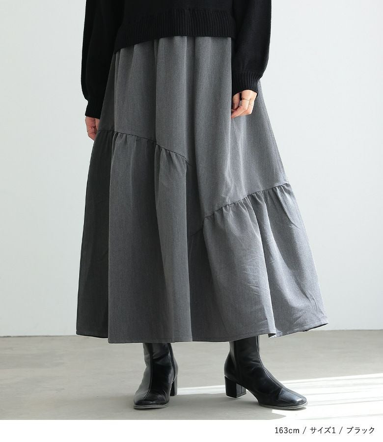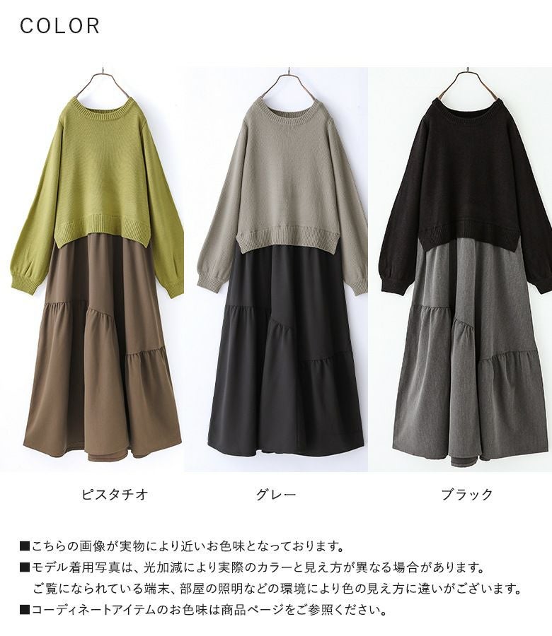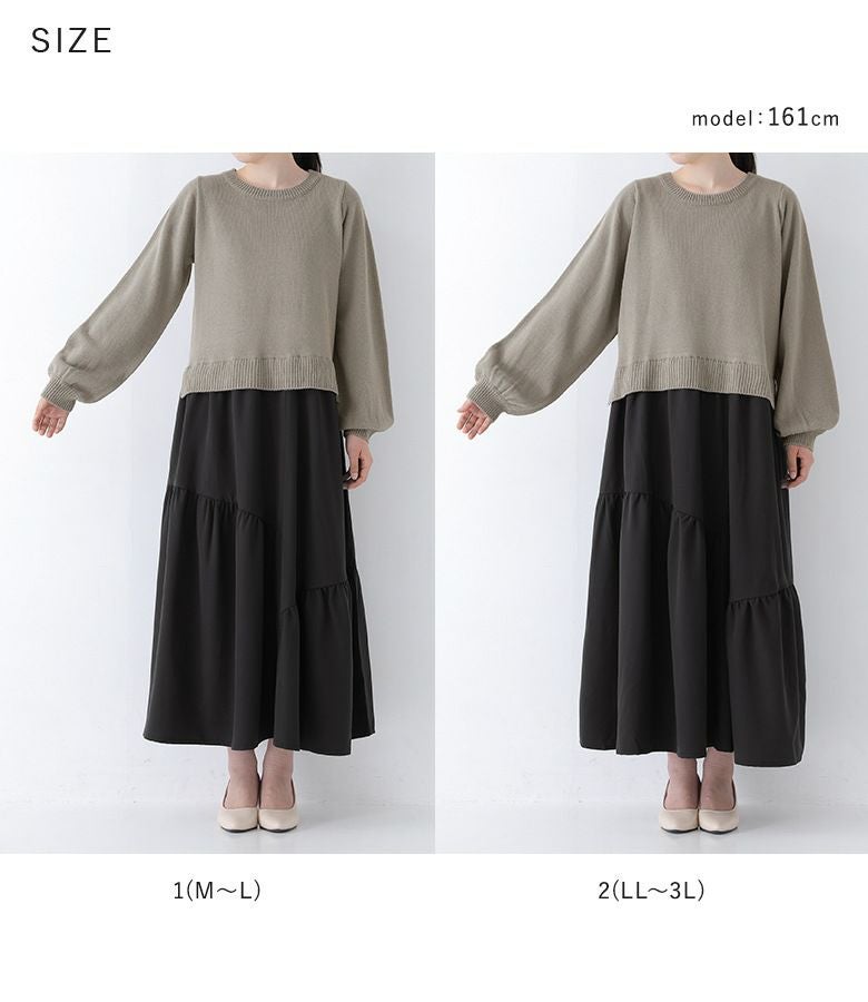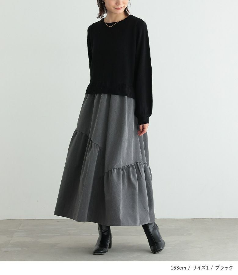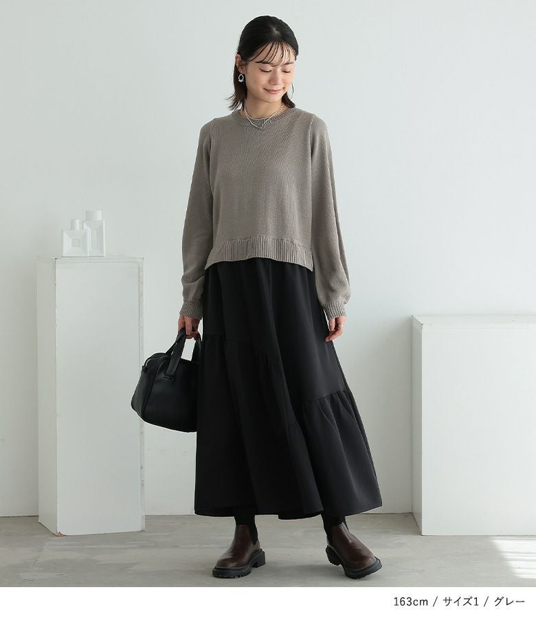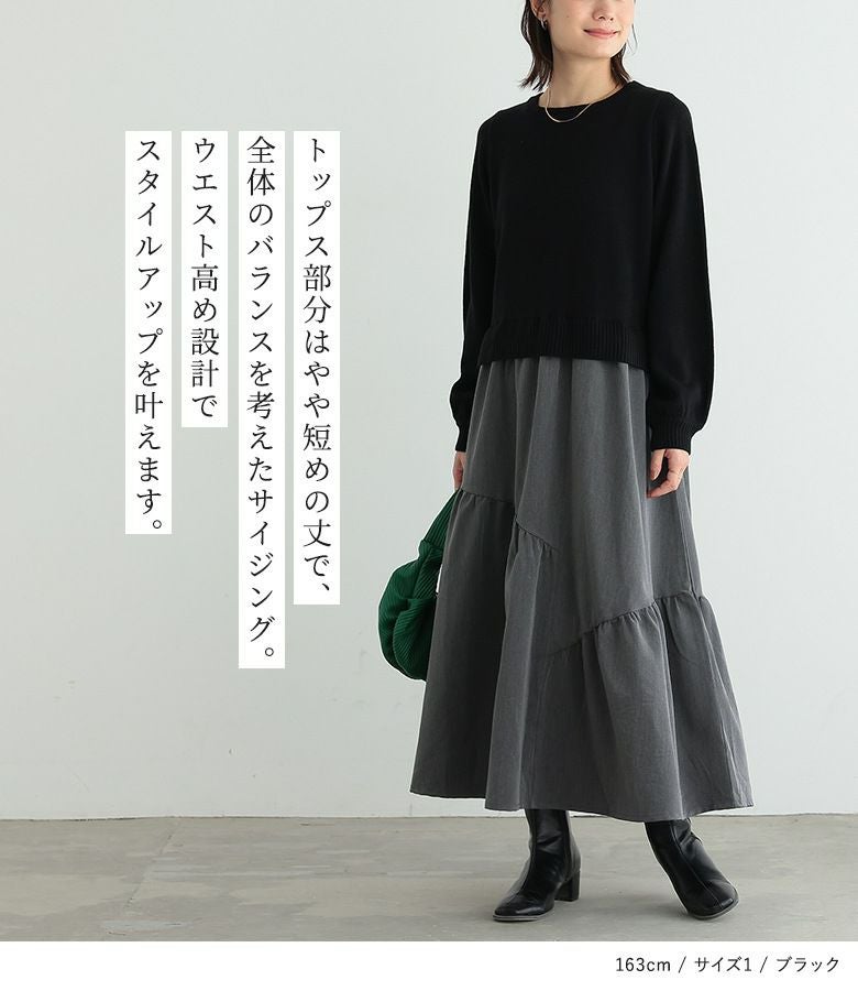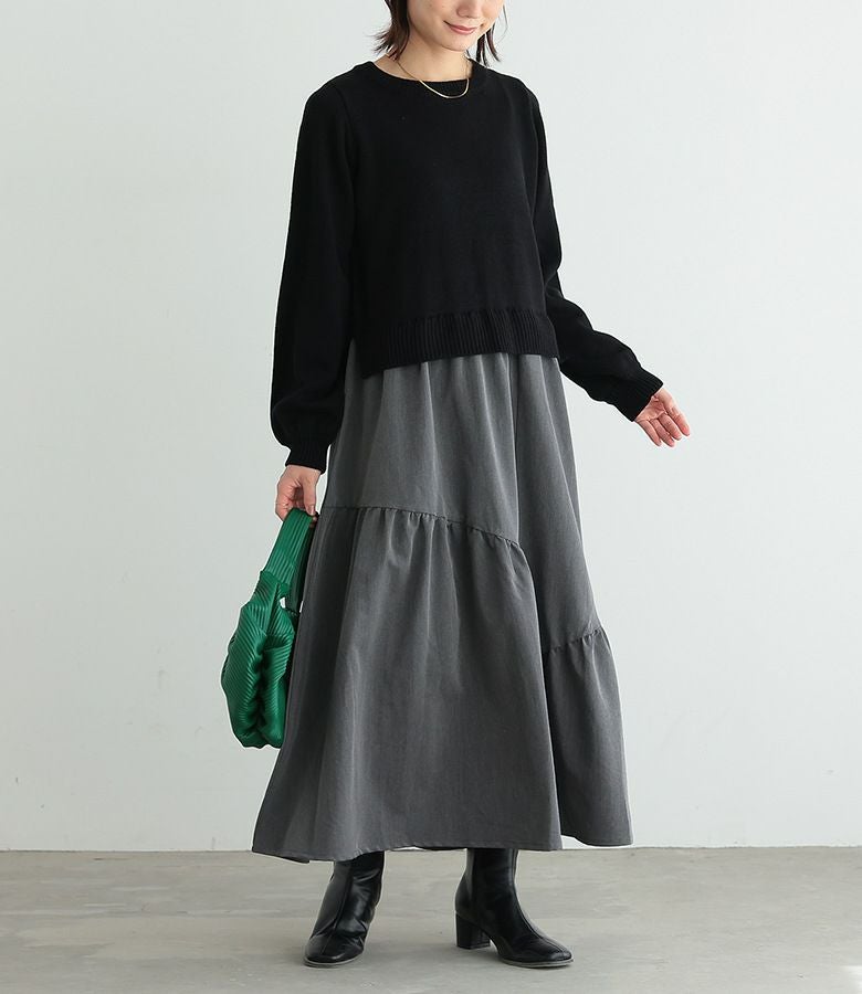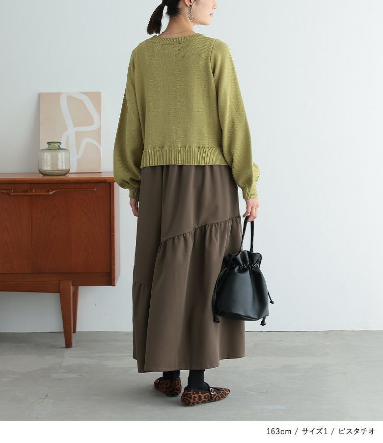 柔らかなパフスリーブニットに、落ち感のあるティアードスカートを合わせた、異素材ドッキングデザイン。