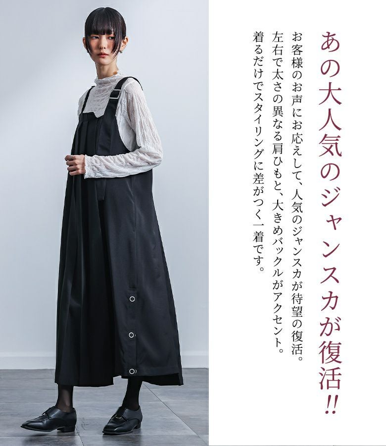 アシンメトリーなプリーツデザインが、モードなお洒落を叶えてくれるジャンパースカート。