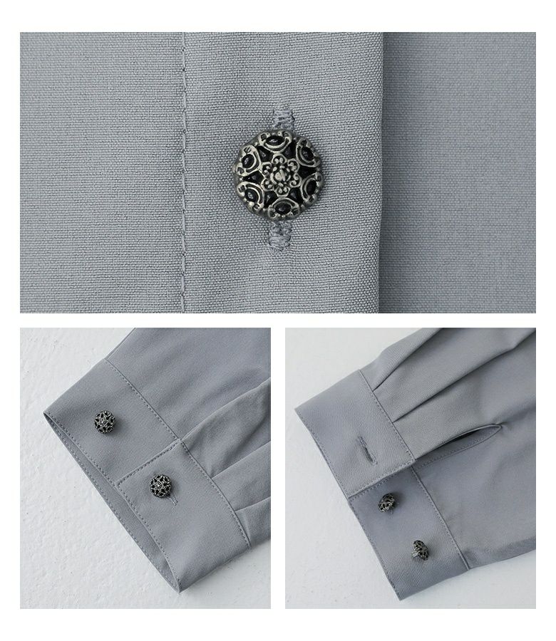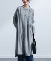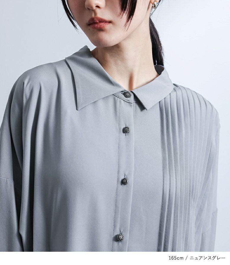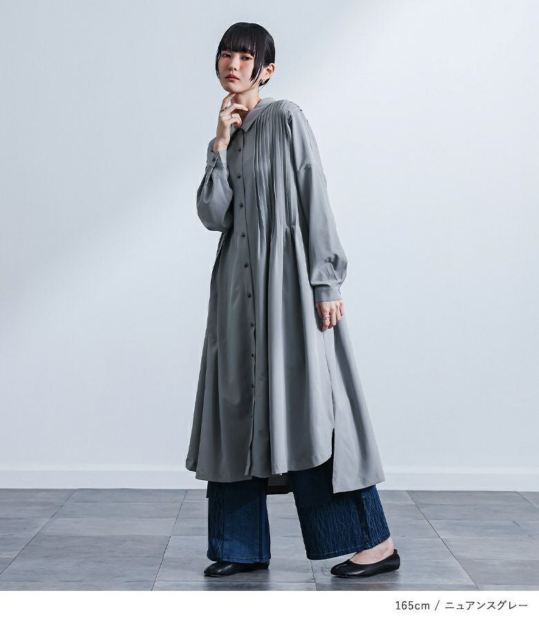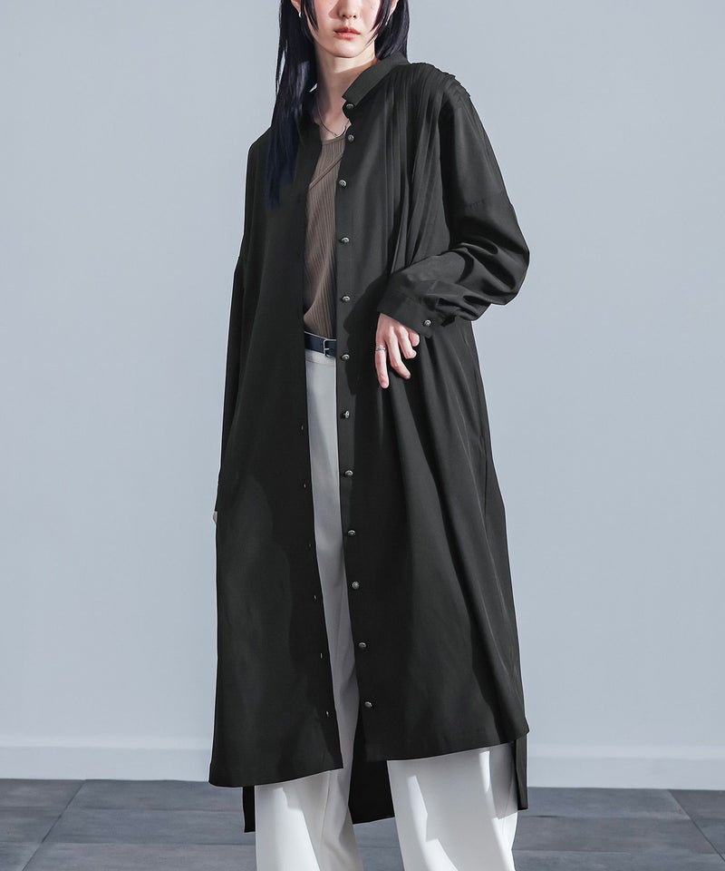 大きさの異なるアシンメトリーな襟がワンポイント。フロントにあしらった細め&太めのタックが着こなしに変化を生み、前後に着丈差を出し深めのスリットを入れることで抜け感をプラスしました。個性的なボタンも目を惹く一枚!