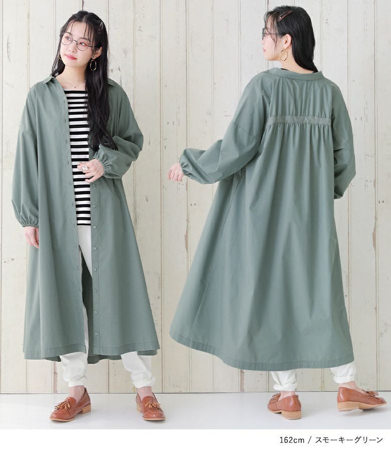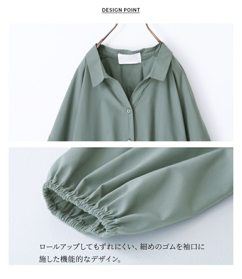 アクセントになる背面のギャザーデザインと、抜け感を演出するスキッパー襟がお洒落見え。ぽわんとしたボリュームが大人可愛い袖には、袖まくりしやすいよう袖口に細めのゴムを入れ、機能性も重視したデザインです。