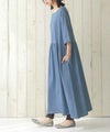 ゆったりドルマンのウエストギャザー仕様で、袖は折り返して5分袖見せもできる、ナチュラルな装いのデニムワンピースです。