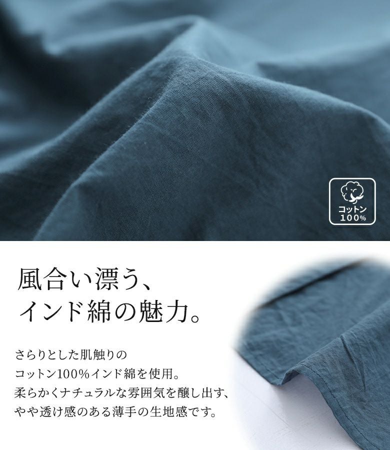 インド綿ならではのナチュラルな雰囲気を醸し出す、さらりと快適なコットン100%素材を使用。これからの季節におすすめの軽やかで薄手の生地感が特徴です。