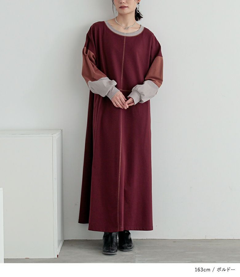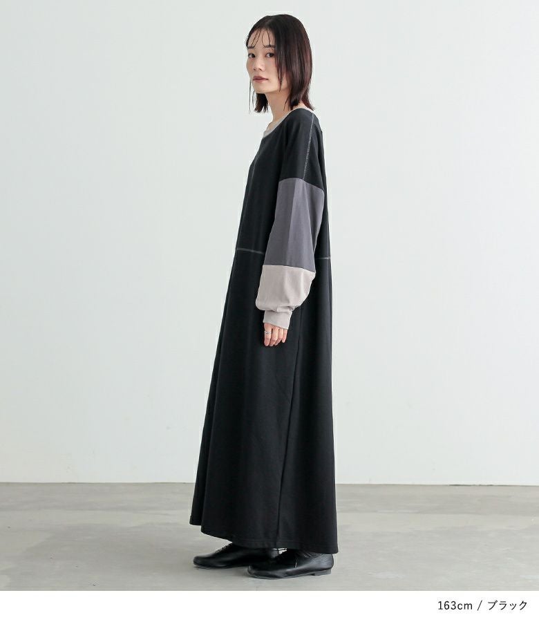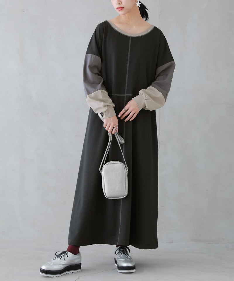 袖&襟の配色切り替えがポイントの1枚でサマ見えするワンピース。ステッチデザインがアクセントになった、マキシ丈で大人っぽく着こなせる一着です。