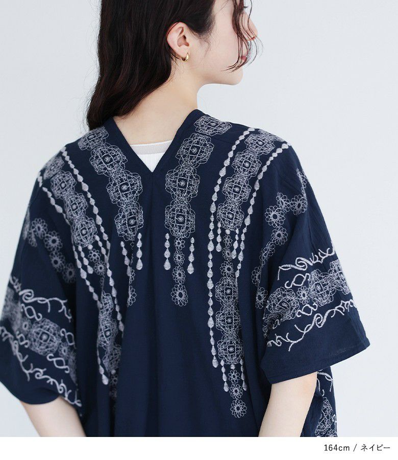 ゆったりとしたサイズ感で楽に着られますが、Vネック&刺繍の縦ライン効果ですっきり見えます♪