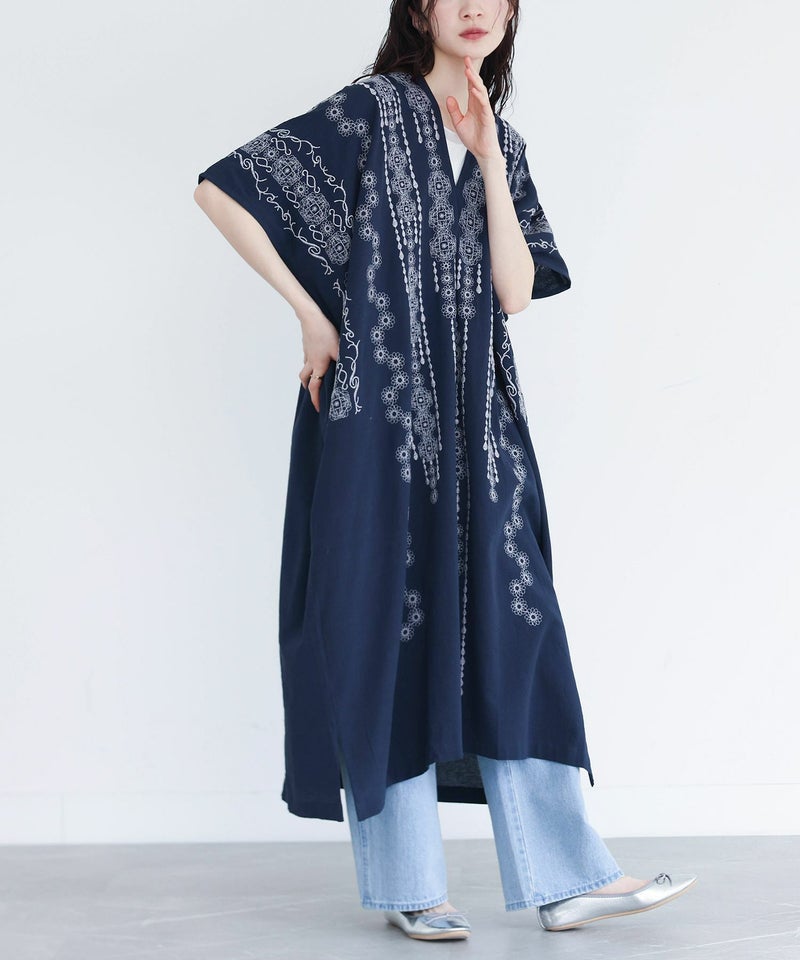 オリジナルの刺繍が大胆に施されたカフタンワンピース。独特な落ち感のあるシルエットと深めのVネックが女性らしさを惹き立てる一着です。