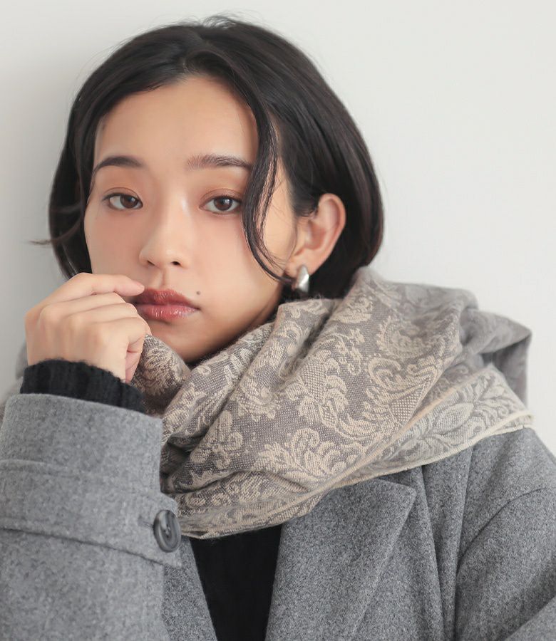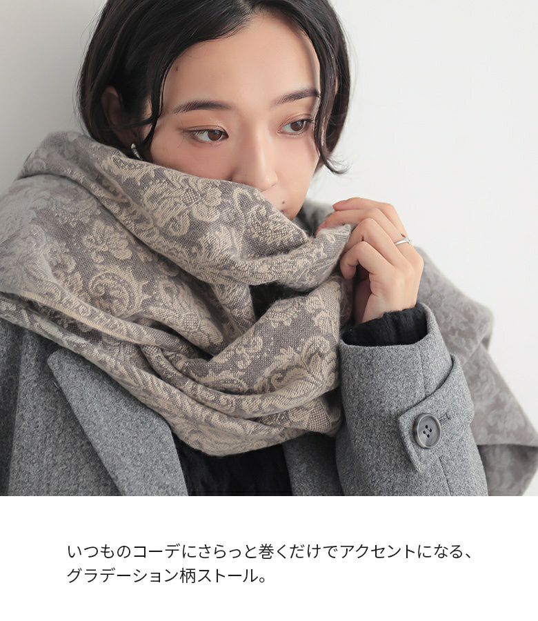 いつものコーデにプラスするだけで、心惹かれる柄とニュアンスグラデーション。巻き方のアレンジで表情の変化も楽しめる優秀アイテムです。