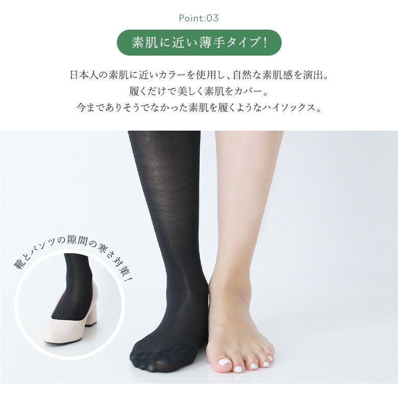 日本人の素肌に近いカラーを使用し、自然な素肌感を演出。履くだけで美しく素肌をカバー。今までありそうでなかった素肌を履くようなハイソックス。