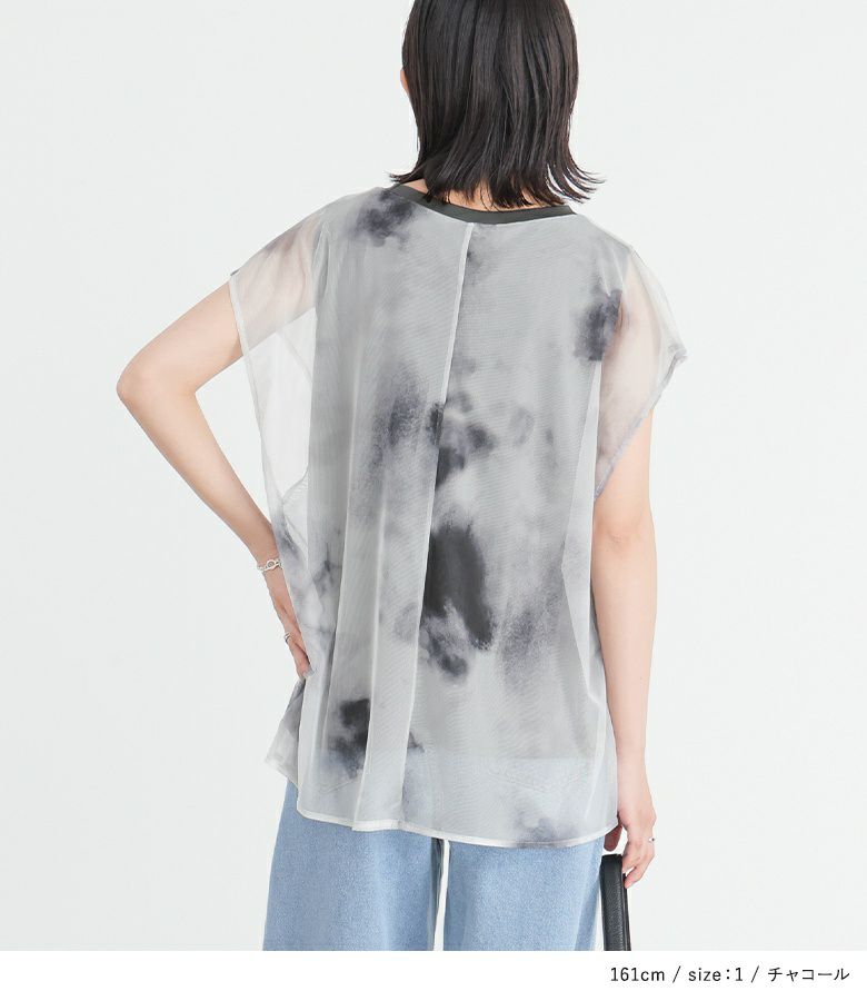 無地のカットソー生地に、ニュアンス柄のチュール生地をレイヤードしたトップス。インナーのカットソー生地とチュール生地を襟元でドッキングし、袖丈と着丈を変えてレイヤード感が出るようにしました。