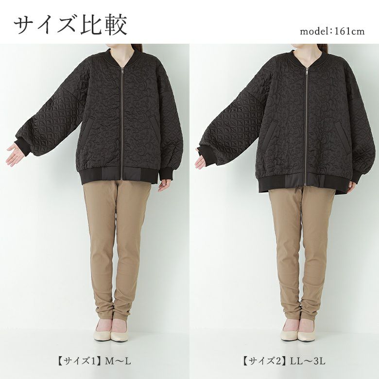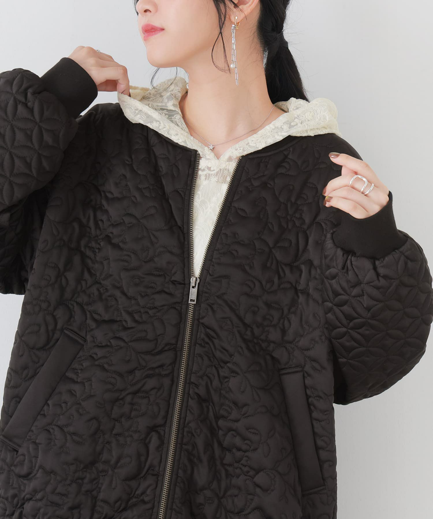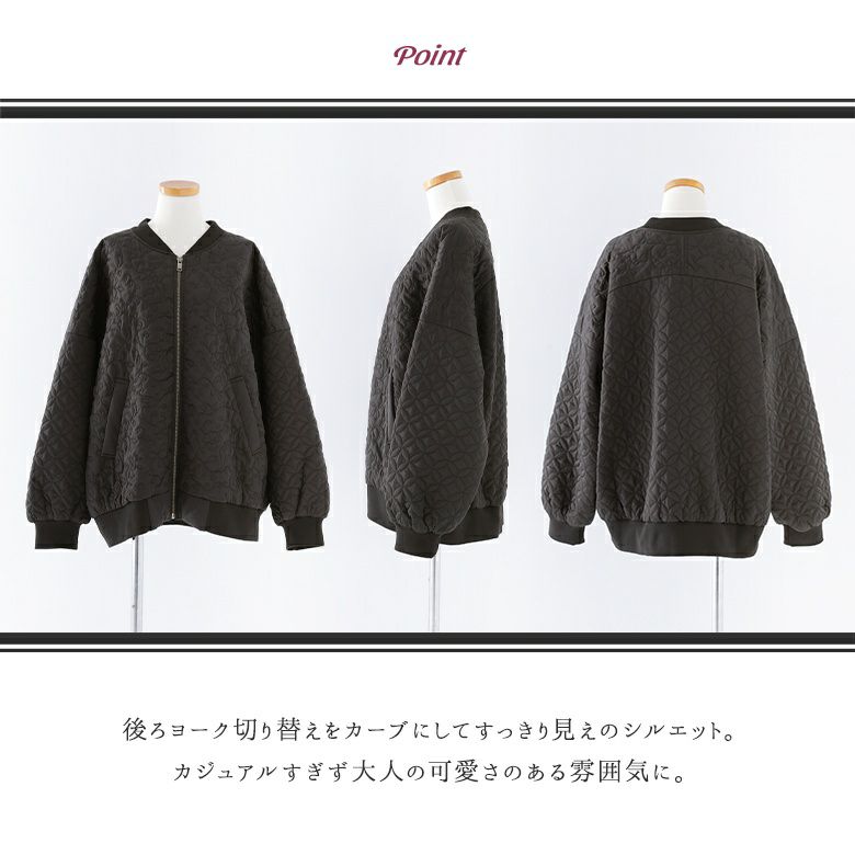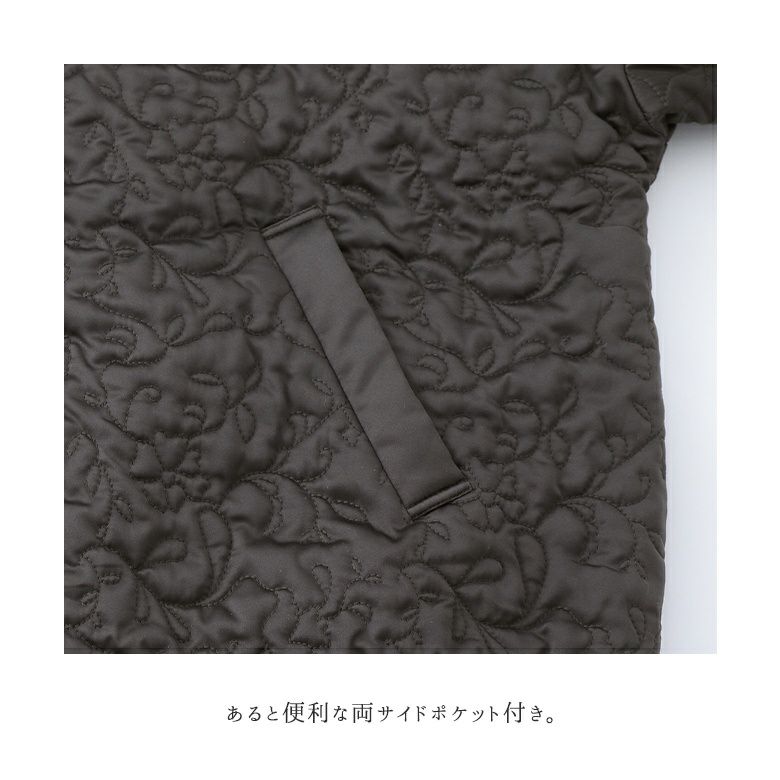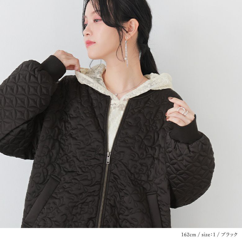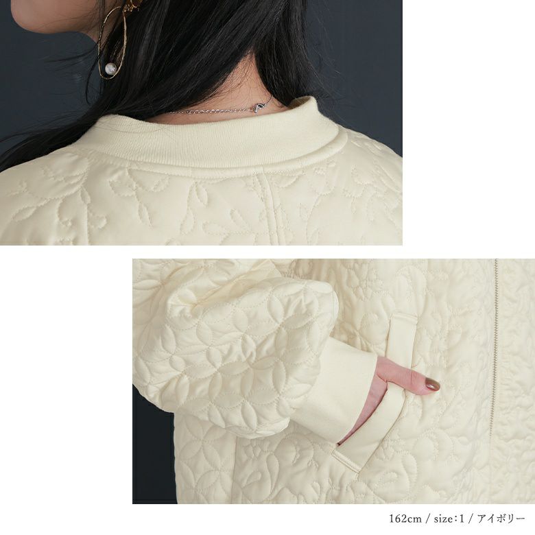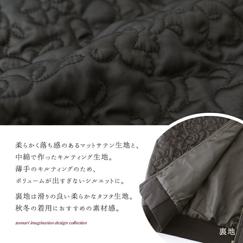 花柄×タイル風の幾何柄キルティングを使った、他にはないブルゾン。中綿入りで軽くて暖かく、ベーシックなカラー展開で色々なアイテムに合わせやすい。