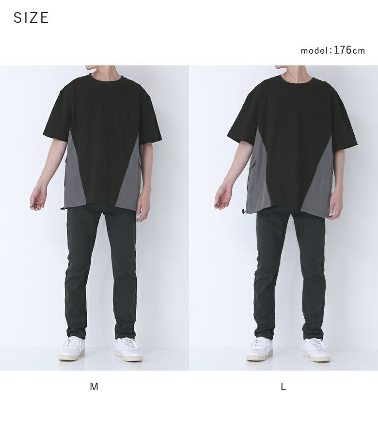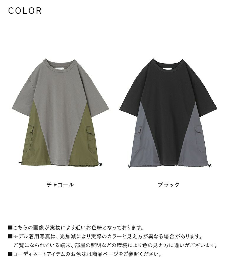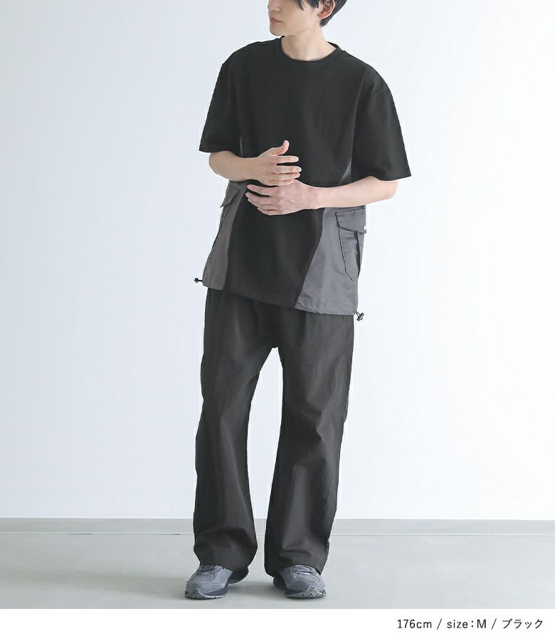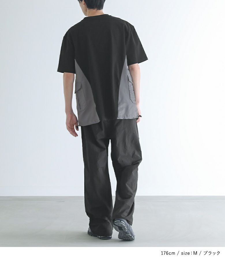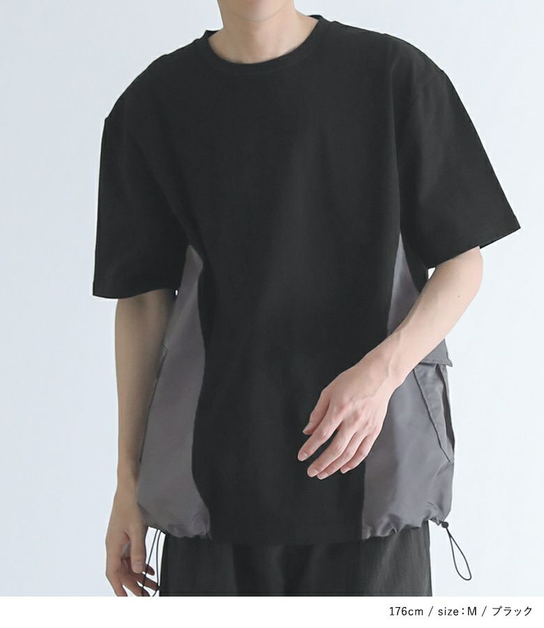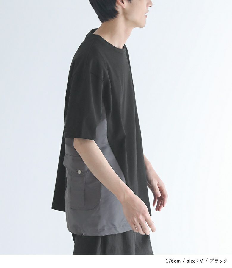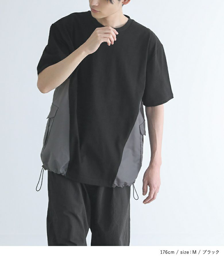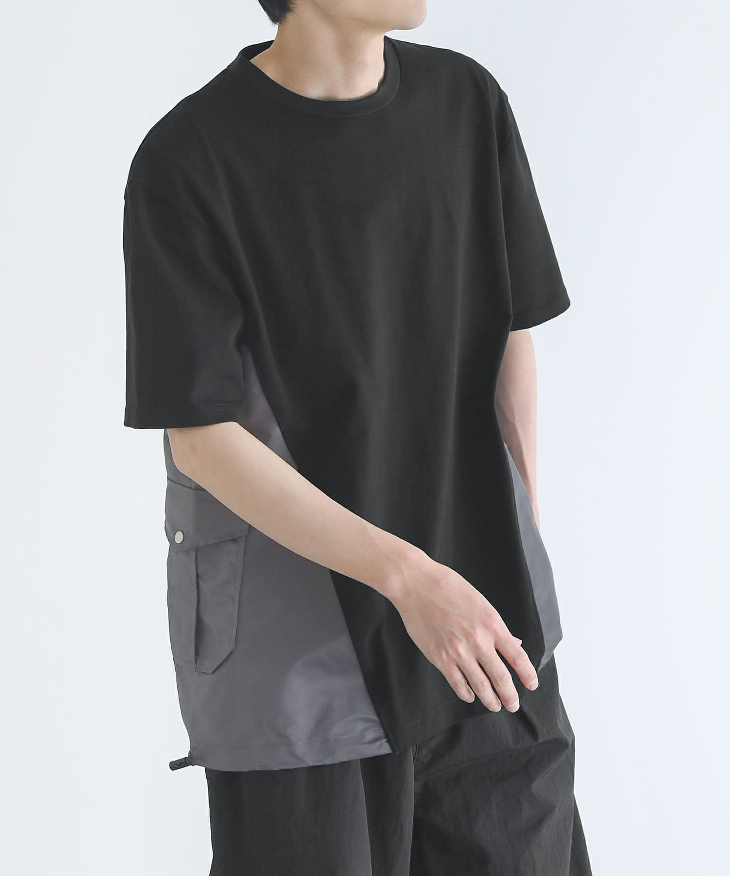 脇の配色切り替えとポケットがポイントになったデザインTシャツ。ナイロン素材のMA-1風なディテールを取り入れたアイテムです。裾を絞ってシルエットを変えられる仕様になっています。オーバーサイズシルエットでゆるっとラフにご着用いただけます。