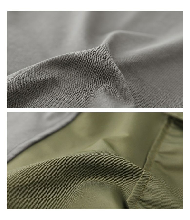 身頃のカットソー生地はコットン100%のさらりとした肌触りです。脇の切り替え部分はつるりとしたナイロン素材を使用しております。