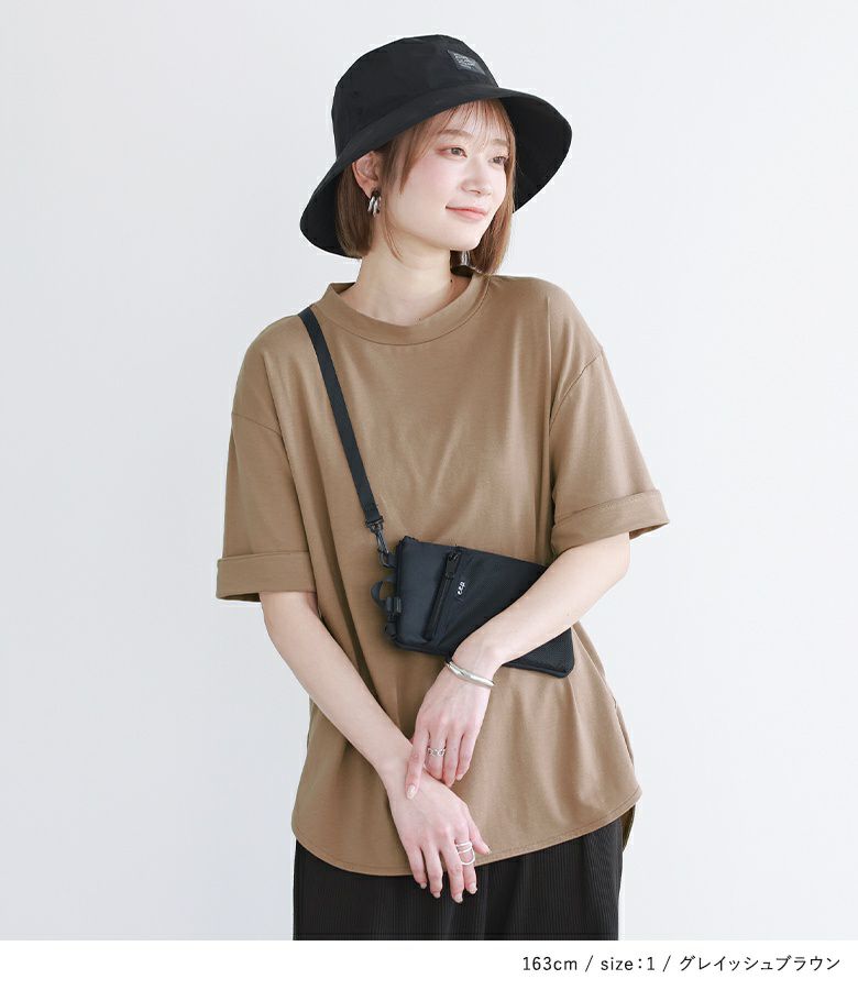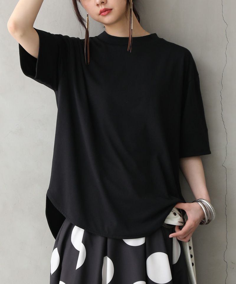シンプルなデザインの中にこだわりが詰まった、着回し力の高いTシャツ。程良い高さのモックネックがこなれ感を演出し、前後着丈差のあるラウンドヘムラインは裾をインしてもそのままでもお洒落見えするデザインです。袖は折り返しても縫い代が見えない仕様になっています。