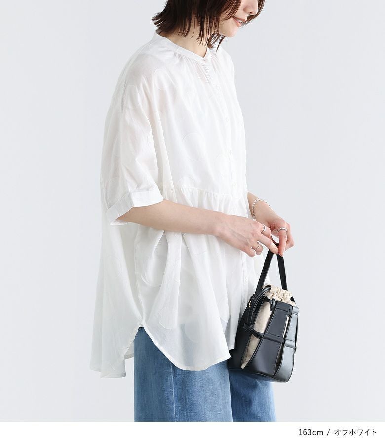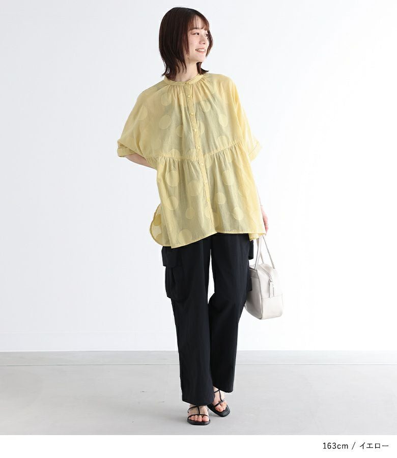 大きめドット柄のカットジャカード生地がお洒落に導くブラウス。同色のドットで、派手になりすぎずご着用いただけます。ゆるっとしたスクエアシルエットとギャザー切り替えが、身体のラインを拾わずこなれた印象に。