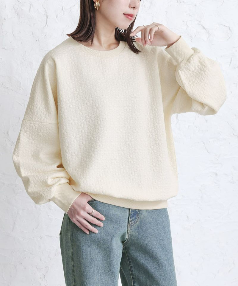 ぽこぽことしたタイル風の花柄ふくれジャカードが大人可愛いトップス。ラフに着用できるゆるっとしたシルエットに、袖口&裾はリブで締めて全体的にメリハリを出したデザイン。ぽわん袖が女性らしさをプラスして、デイリーにも品良く着用できる一枚です。
