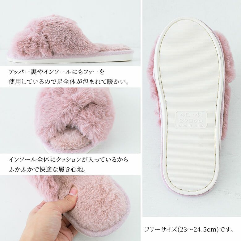 ボリューム感のあるフェイクファー素材は、柔らかくずっと履いていたくなる気持ち良さ。アッパー裏やインソールにもファーを使用しているので、足全体が包まれて暖かく、冷え対策にも活躍します。