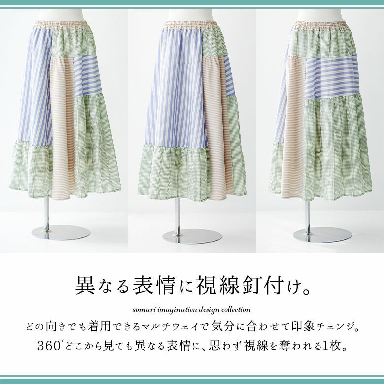他の画像を見る 【40%OFF】堀出し物いっぱい★感謝価格item!!爽やかな配色が目を惹くパッチワークスカート♪ 『somari imaginationパッチワークフレアスカート』※返品交換不可※【メール便不可】【20】 定価 ¥ 6,900 のところ ¥ 4,139 税込 4.60 (5)