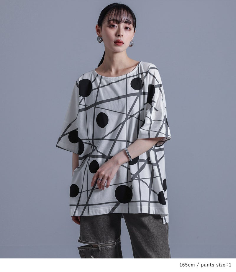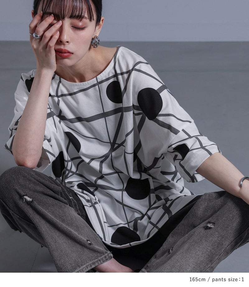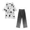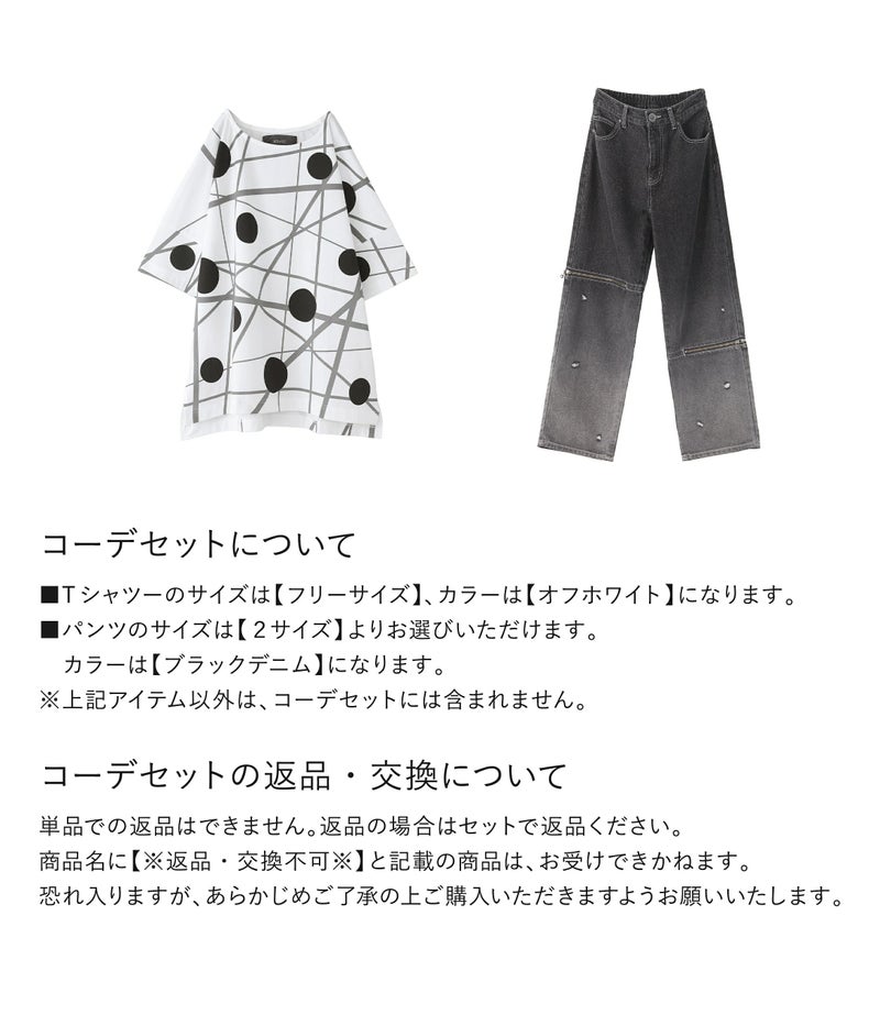 『ランダムドット柄モードTシャツ×ジップデザイングラデーションデニムパンツコーデ2点SET』