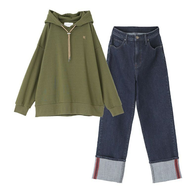 『ロゴ刺繍デザインフーディー×ロールアップストレートデニムパンツコーデ2点SET』