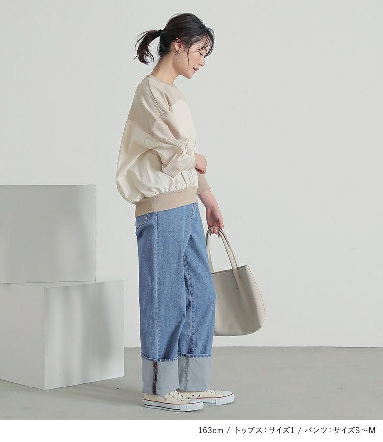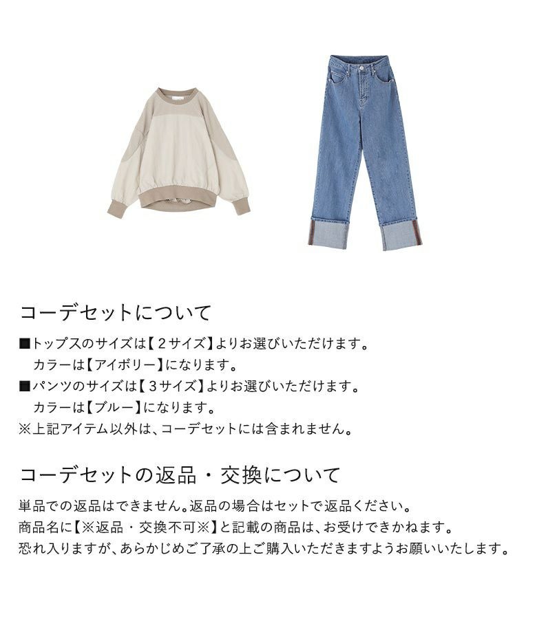 『異素材切り替えプルオーバー×ロールアップストレートデニムパンツコーデ2点SET』